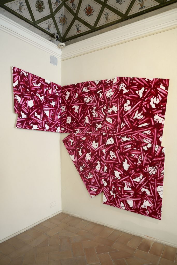 «La mostra potremmo definirla un’antologica concentrata, composta da trenta opere o gruppi di opere realizzate dal 1980 al 2020 (quindi il suo intero percorso professionale), con alcuni dei cicli più rappresentativi della sua ricerca (Tromboloidi, Azota, Eroica, Zeimekke), opere in grado di dialogare con lo spazio espositivo inserendosi non solo sulle pareti, ma negli angoli, a terra, sfruttando asimmetrie e sconfinando dai limiti stessi delle cornici architettoniche. Sala dopo sala il percorso si fa sempre più carico di energia, i quadri sembrano nuclei atomici che si disperdono nello spazio, fino ad arrivare all’ultima sala dove elementi irregolari su plexiglass (da Adsrubali definiti ironicamente “Schegge”) sembrano sviluppare l’intuizione dei Quanta di Lucio Fontana in maniera ancora più esplosiva e aleatoria».
