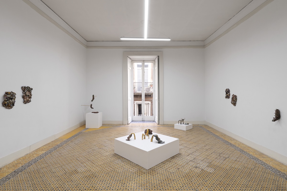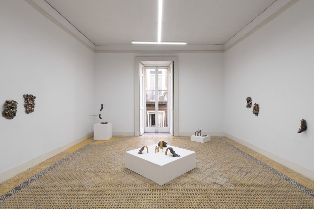 E così lo spettatore resterà piacevolmente affascinato da queste creature sconosciute, osservandole strisciare sui muri, abbandonare i propri involucri in un processo di metamorfosi evolutiva stupefacente. Si tratta di ibridi generati dall’unione tra il mondo animale e vegetale (come le sculture centrali “Nimphaeceae Chloroticae”), appartenenti tanto al preistorico quanto a un futuro che possiamo solamente immaginare. Creature che provengono dal sottosuolo per riemergere in superfice, esseri stratificati, attraversati dall’acqua (come nelle sculture “Origo Fexuosa #1 e #2”) sotto forma di infiltrazioni che scavano l’opera dall’interno.