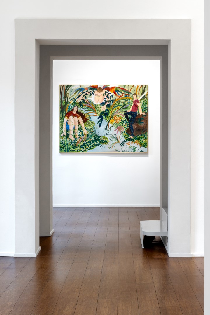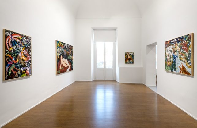 Antonio Kuschnir è classe 2001, quindi giovane. Un giovane che fa una pittura tendenzialmente meno giovane del ventiquattrenne che è. Prima di rischiare il linciaggio per age shaming (o accusarci, più prosaicamente, che stiamo dando ad Antonio del vecchio), pensate a quando leggete un qualunque articolo di critica: dell’artista, per solito, viene indicato l’anno di nascita. Questo non per voler gossippare sull’artista (pur non essendo il mondo dell’arte immune ai gossip, sia chiaro), ma perché il numero di primavere ha un peso specifico sulla contestualizzazione critica del soggetto in questione. Quindi, così come un comune mortale può trovarsi con l’età biologica non allineata a quella anagrafica, la ricerca condotta da un artista può trarre in inganno sull’età dello stesso. Fateci caso. Poi fateci anche sapere se la pensate come noi su Kuschnir e O Canto do Rio (a cura di Barbara Magliocco), personale che porta da ABC ARTE un ragazzo molto concentrato sui temi e problemi della pittura prima di lui, utilizzati come possibilità figurative utili a risolvere altrettanti temi e problemi affrontati nella propria pittura. Possibilità che passano per figurazioni enigmatiche, bucolicismi tutt’altro che bucolici, esotismi brasiliani e presenze nascoste ovunque. Anche nel buio.