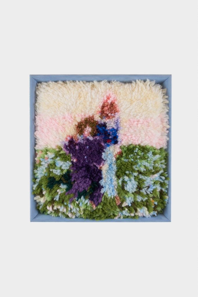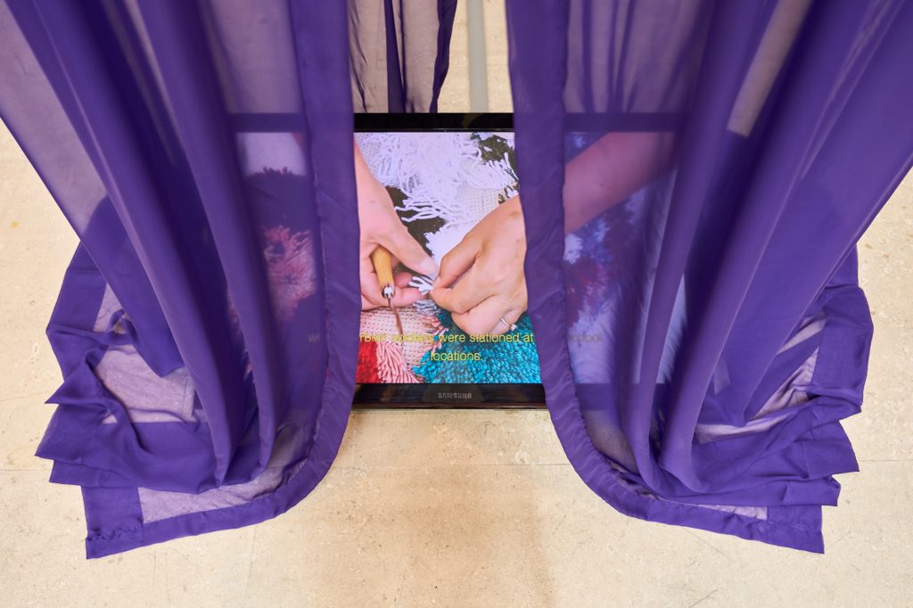 L’opera che occupa lo spazio in vetrina, dal titolo Reunion with aunts and uncles, è esemplificativa dei concetti espressi fino a questo punto. Alla base di una installazione tessile circolare di colore viola, è posizionata un’opera video che presenta la zia, la madre e la nonna dell’artista mentre realizzano un particolare tipo di tappeti —i “Jani”, solitamente parte della dote di nozze— con una tecnica di ricamo tipica del Kosovo. L’influenza del paese natale, oltre al ricamo, si percepisce tramite i racconti delle donne sulla guerra combattuta in Kosovo dal 1998 di cui sono state testimoni. I quadri tessili appesi alle pareti riprendono l’atmosfera dell’installazione centrale e ripropongono frammenti di vita familiare.