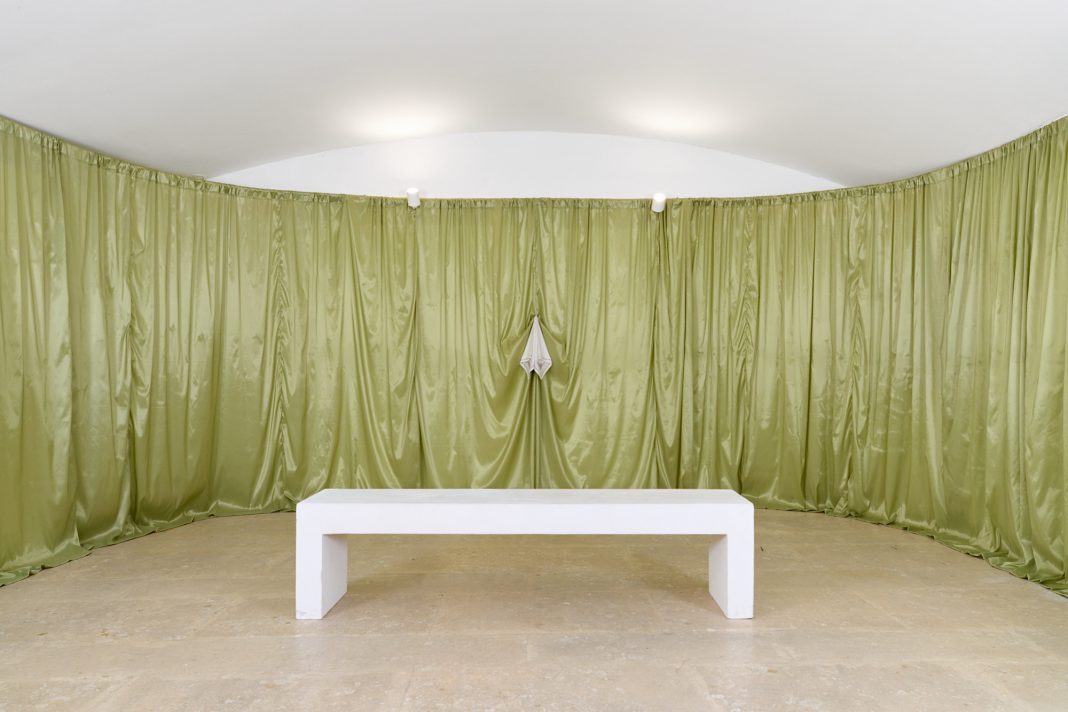 Un’installazione tessile site-specific, dal titolo Bouquet Bouquet, occupa la sala centrale attraverso un percorso ondulato che coinvolge fisicamente il visitatore. L’artista presenta alcune parti del corredo nuziale decorato dalla madre nel 1982, con un significato emotivo forte derivante anche dall’uso quotidiano dei tessuti. Una raccolta di centri e copriletti ricamati, realizzati dalle donne della famiglia dell’artista, che rappresentano tracce di un passato a cui Barbara dona una nuova essenza creando un viaggio tra i ricordi ma con uno sguardo sempre rivolto al futuro.