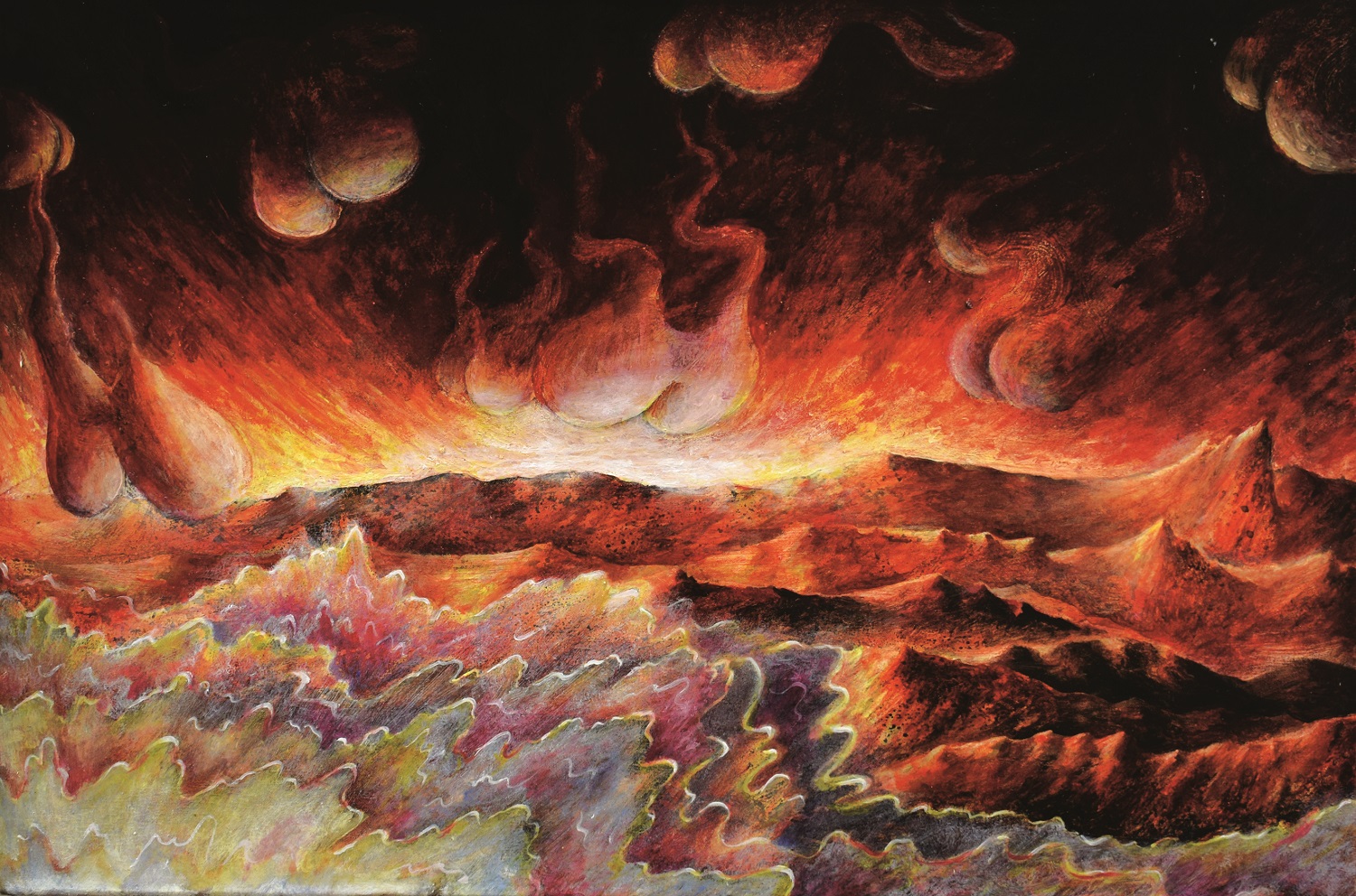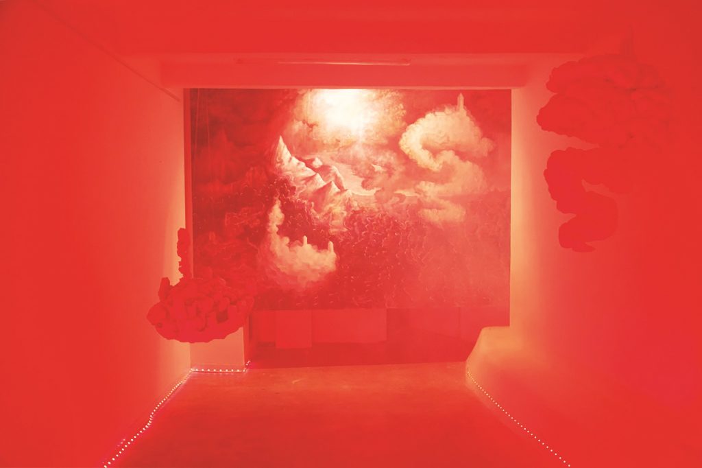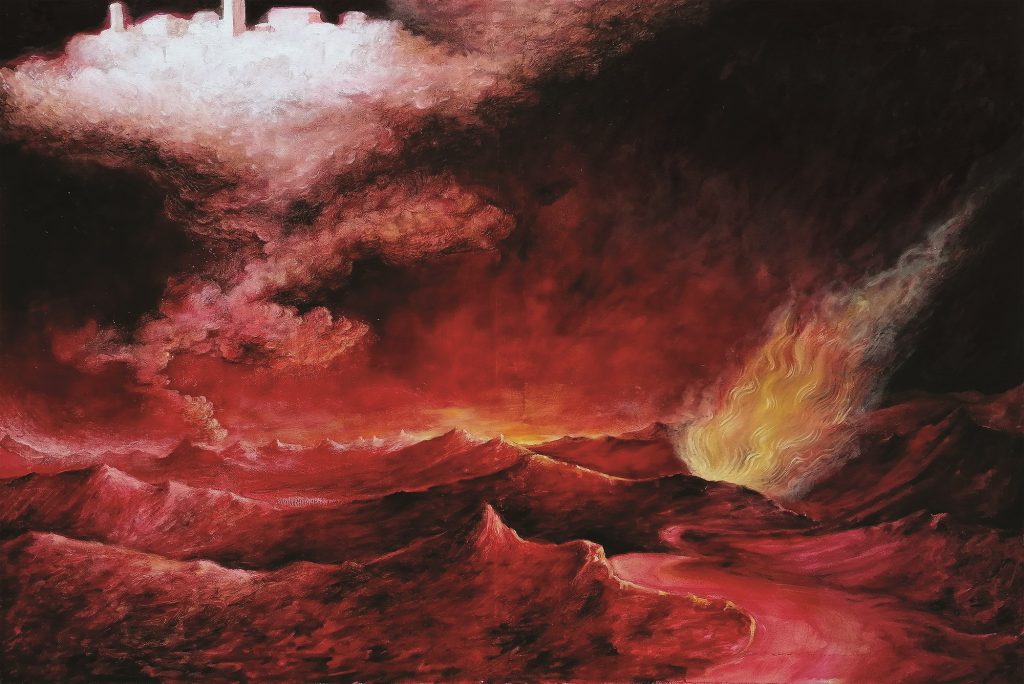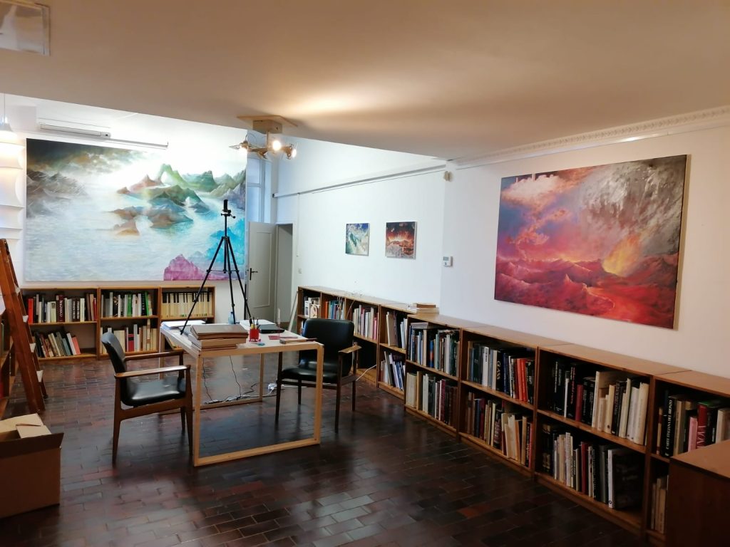 L’opera di Malinverni, artista piemontese da anni a Venezia per gli studi all’Accademia di Belle Arti, prima con il diploma in restauro e poi i corsi di pittura all’Atelier F con Carlo Di Raco, si inserisce in questo contesto: di certo non nasce dalla pandemia, ma ha trovato in essa una spinta ad accrescere una duplice condizione, l’ossimoro del “paradiso infernale”. Malinverni si muove con un agire artistico che prende esempio dalla tradizione di grandi maestri o artisti poco noti del ‘400 e ‘500 – nei paesaggi, nelle architetture degli edifici mostrati, che slittano fino al ‘900 della Metafisica di De Chirico – ma introduce nella composizione dell’opera una componente, un “virus”, che rende incerta la sensazione ultima dell’immagine, ora apparentemente aulica ora drammatica, e crea un senso di spaesamento, di disequilibrio percettivo nello spettatore. I diversi toni di blu, i verdi tenui, che danno vita a un lavoro dove in scena c’è un’apparente serenità, turbata da striature di colore che paiono richiamare piogge bibliche, lasciano spazio in altre opere a rossi cupi o gialli accesi che formano idealmente paesaggi che ricordano scene immaginate sulle origini del mondo, eruzioni di vulcani, catartiche ribellioni della Madre Terra. Paradiso e Inferno sembrano coesistere nella stessa opera: allo spettatore, immerso nel clima di incertezza attuale, il compito di scegliere tra i due. L’artista non viene, però, in suo aiuto ma anzi inserisce degli elementi che disorientano ulteriormente: soggetti fuori contesto, simboli, arditi accostamenti, tra cui lo spettatore deve individuare e scegliere i propri punti di appoggio. Tutto ciò nel contesto della libreria antiquaria di Padova, che diventa parte integrante del progetto espositivo, in particolare con l’opera-installazione che Malinverni ha ideato per la sala-cripta della libreria, in chiave quasi dantesca.