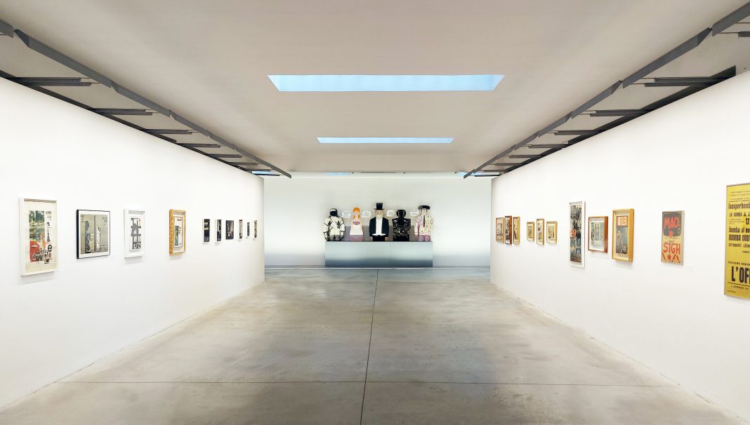 Esempi di cosa incrociano i nostri occhi sono l’opera Si Barone di Lucia Marcucci del 1964, un collage di ritagli di estratti di giornale su cartone, oppure sempre della Marcucci Fra tutti si distingue del 1965, in cui l’attrice Ingrid Bergman sfila in tre abiti disegnati da Nina Ricci per il film La vendetta della signora, già il titolo è indicativo, l’adesione acritica alle tendenze della moda rende le donne vittime e prigioniere di uno status symbol. Ketty La Rocca colpisce con le sue frasi collage Minaccia la vita del 1964/5, o, come nel lavoro Dolore…come natura crea, affianca la parola dolore a una serie di raffigurazioni di visi e parti della donna. Ci attardiamo anche nella lettura della Partitura del 1961 di Giuseppe Chiari. Compositore che gioca con la musica, il linguaggio, il gesto e l’immagine. Di Luciano Ori abbiamo temi politici come ne Il metro e l’ora del 1965 con richiami a Nikita Krusciov, ex capo dell’Unione Sovietica, affiancato da articoli sulla lotta dei neri. Colpiscono I disegni inediti di Luciano Pignotti Hanno messo a nudo la piaga dell’omertà e della corruzione.
