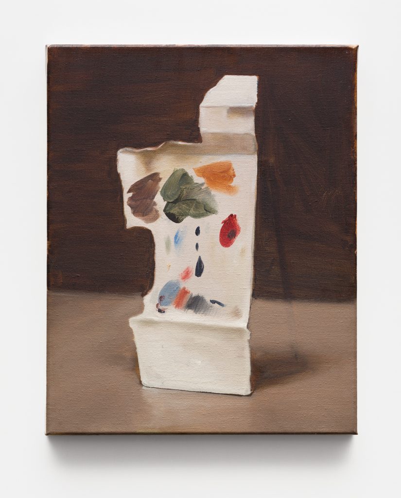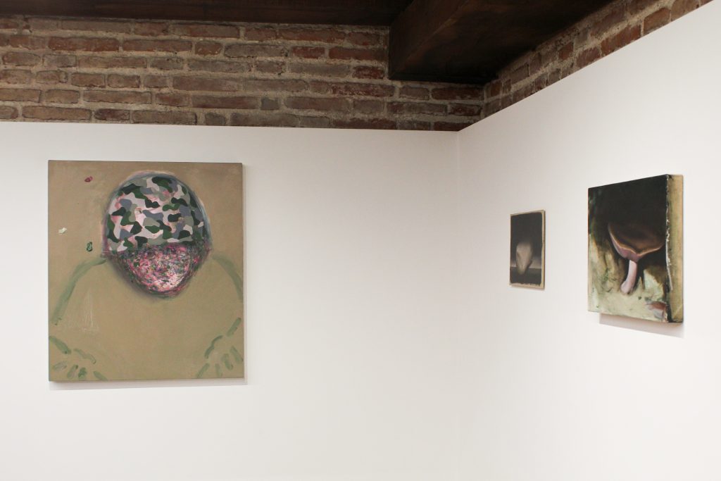 In uno schema di rimandi e di contrasti, i due artisti mettono in scena una riconsiderazione del soggetto attraverso un diverso orientamento dello sguardo e ciò è da subito comprensibile. Al primo piano del torrione, come già era stato nel primo atto della mostra, gli occhi sono portati verso il basso, verso la terra; quella magmatica, materica e proliferante di vita che il soldato di Luca Bertolo sembra osservare negando la possibilità di identificarlo pur essendo questo soggetto di un ritratto. Laddove, invece, la figura è leggibile, come nella Natura morta con melograno, l’artista sembra voler sfidare la storia del genere piegandolo alla sua personale poetica fondata sulla matericità della pittura, che è il vero soggetto della tela. Manuele Cerutti, dal canto suo, opera questa riconsiderazione della pittura figurativa conferendo a elementi inanimati, minimi e liminali la dignità di protagonisti delle sue descrizioni realiste. Tali oggetti, infatti, sono sviluppati nella pratica dell’artista conferendo loro la stessa complessità caratteriale e atmosferica che definisce la ritrattistica.