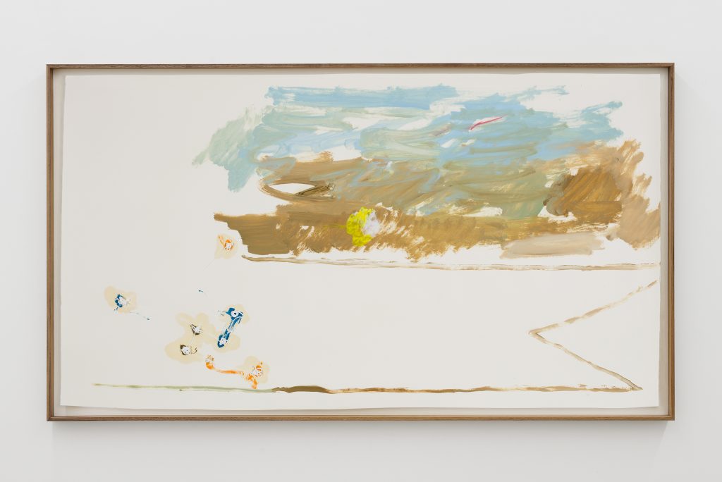 Questo livello e il successivo intrecciano le loro trame grazie alla presenza di un ballatoio che permette dunque la visione simultanea delle opere lì presenti. La scena del secondo livello è dominata dal grande Untitled, 2023 di Pesce Khete, il quale si estende orizzontalmente lungo buona parte della parete che accoglie lo spettatore in salita. Il sapiente bilanciamento di colore e monocromia, concitamento e pulizia dell’immagine, paesaggio e ritratto è sottolineata dalla caratteristica scelta dell’artista di ricorrere al nastro adesivo quale limes oltre cui si sviluppa e si estende lo spazio della ragione attraverso l’aggiunta di fogli di carta, in assoluto il supporto prediletto da Pesce Khete.