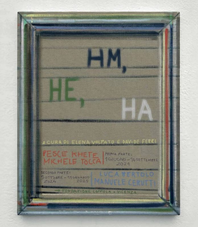 HM, HE, HA è un progetto espositivo in due atti ideato da Elena Volpato e Davide Ferri che vede protagoniste alcune recenti opere di Pesce Khete, Michele Tocca, Luca Bertolo e Manuele Cerutti accomunate non tanto da un tema o da un certo fare pittorico, quanto piuttosto da una predisposizione a soffermarsi sul valore della riflessione e dell’indugio.
