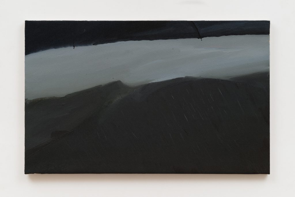 Alternate a queste rappresentazioni volutamente mancate si trovano altri silenzi pittorici, silenzi metaforici in questo caso. La serie, iniziata diversi anni addietro, in cui è rappresentata la giacca da pioggia di Michele Tocca veicola l’idea un momento di riappacificazione al termine della sessione di pittura. Quest’indumento, appeso alla porta azzurrina della casa del pittore in maniera sempre differente, ora perché bagnato, ora perché appesantito da qualche oggetto all’interno della tasca, si configura però anche come una specie di autoritratto. L’artista riconosce nella giacca un’epidermide che assorbe, che è impregnata di paesaggio e tramite questa è possibile mostrare pur senza rappresentare, in absentia e in silenzio.