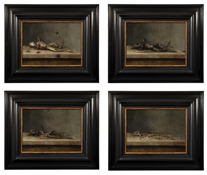 L’esposizione si sviluppa in un’intima sala dell’hotel, dove l’atmosfera cupa e misteriosa ben si sposa con le opere appartenenti alla serie Trasforming. Ecco che qui due apparenti quadri, in realtà display, riproducono dei cortometraggi in loop, ritraenti una natura morta che sembra dipinta dalla mano di artista del XVII secolo olandese, sullo stile dei dipinti Vanitas.