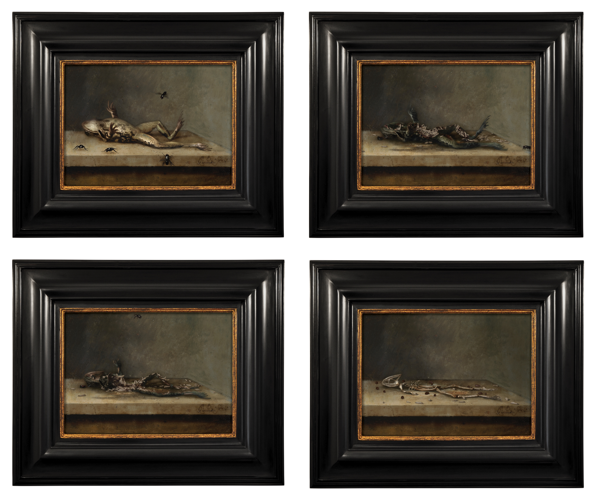 Il contrasto fra il supporto digitale dell’opera e il contenuto della stessa, di una estetica rinascimentale, crea una sorta di disorientamento nell’osservatore che, una volta soffermatosi ad osservarli, rimane sorpreso dall’entrata in scena di una mosca, la quale attraversa questo spazio – apparentemente morto – per poi andarsene riportandoci in questo equilibrio statico-dinamico. L’opera ritrae una rana morta in uno stato di progressiva decomposizione, man mano che il tempo scorre. Di lei, alla fine, rimangono solo le ossa.
