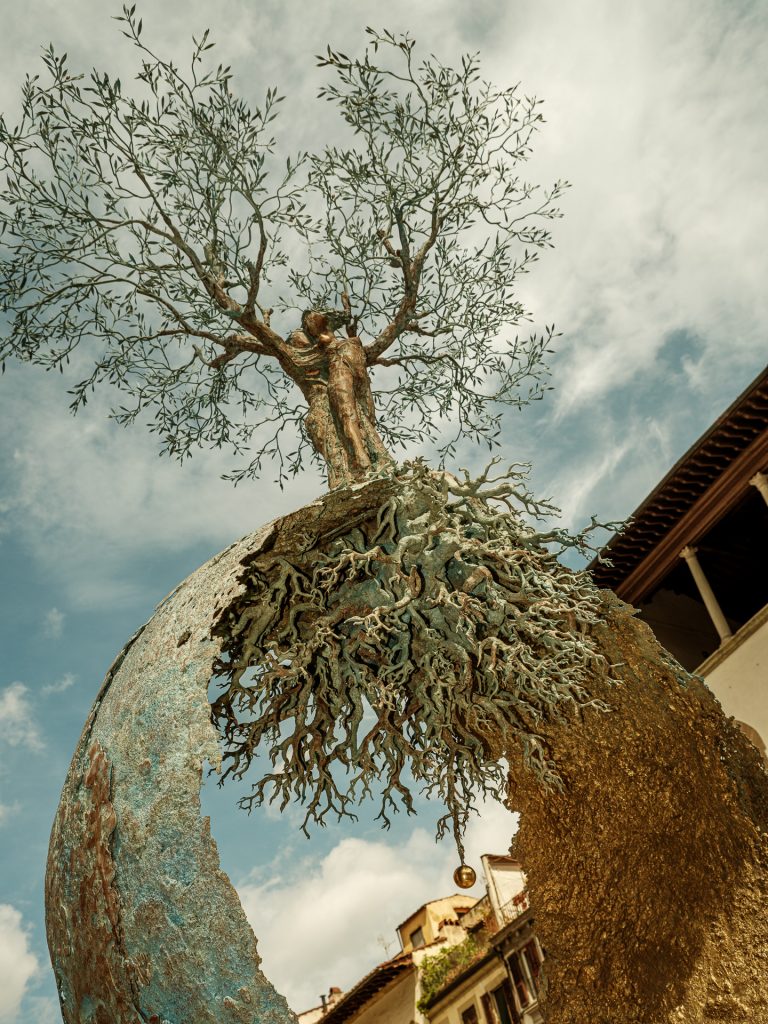 L’albero è, inoltre, simbolo di conoscenza, altro concetto caro alla poetica di Roggi; secondo quanto affermato dallo scultore esso è «metafora dell’uomo che si deve comportare come un albero: prendere il meglio con le radici e darlo alle generazioni future, le olive, i nostri frutti.» Le radici sono iscritte nel globo terrestre, come nell’Albero della Vita, connubio di materia e spirito che richiama le tematiche della conoscenza e dell’impegno a diffonderla all’esterno, come un polline.