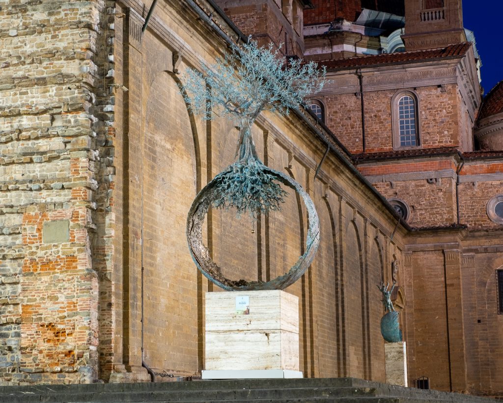 Le sfere su cui poggiano questi ibridi tra umano e vegetale sono simboliche e rappresentative di un’altra parte di produzione dell’artista, che si trova all’interno del chiostro: in particolare, viene esposta Imagine all the people, un complesso globo realizzato a traforo composto da figure umane a tutto tondo che celebra, attraverso la celebre frase di John Lennon, la diversità umana.