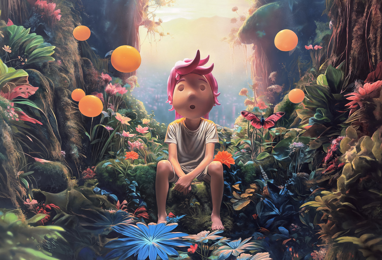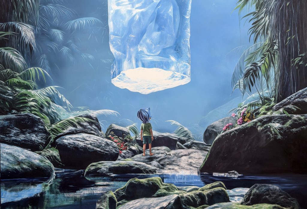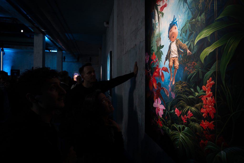 Quando incontriamo JonnyBoy è forse già troppo tardi? Immersi nello sfarzo, in una festa all’insegna del drink creato dall’altro personaggio di questo universo, due facce di un mondo che “beve per non ricordare”. Accanto alle installazioni, infatti, compaiono opere pittoriche e sagome dipinte raffiguranti il giovane che contribuiscono al rafforzamento di un immaginario sospeso tra natura e cultura pop, in cui colori saturi e simboli ricorrenti evocano una dimensione fuori dal tempo. E il ragazzino si trova sempre con la stessa espressione, in cui Giovanni Motta identifica tre astrazioni: “Una positiva, la meraviglia, una negativa, che è la paura e infine una neutra, lo stupore…”. Ed è come se il personaggio ideato da Motta racchiuda in sé tutte queste emozioni, come se in quel volto fanciullesco ognuno possa specchiarsi fino a trovarci un riflesso della propria interiorità. Ci si può stupire di fronte ad un quadro, di fronte ad un bel palazzo, dinnanzi ad un monolite di ghiaccio alto nove metri da cui sgorga una sostanza magica e sconosciuta.