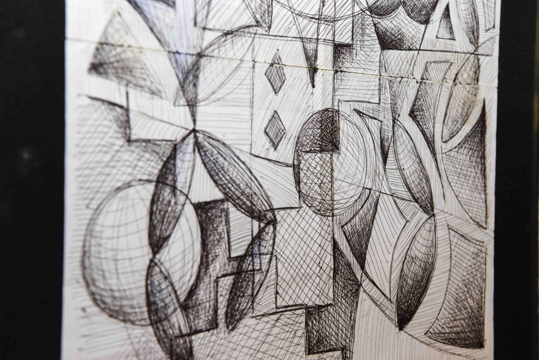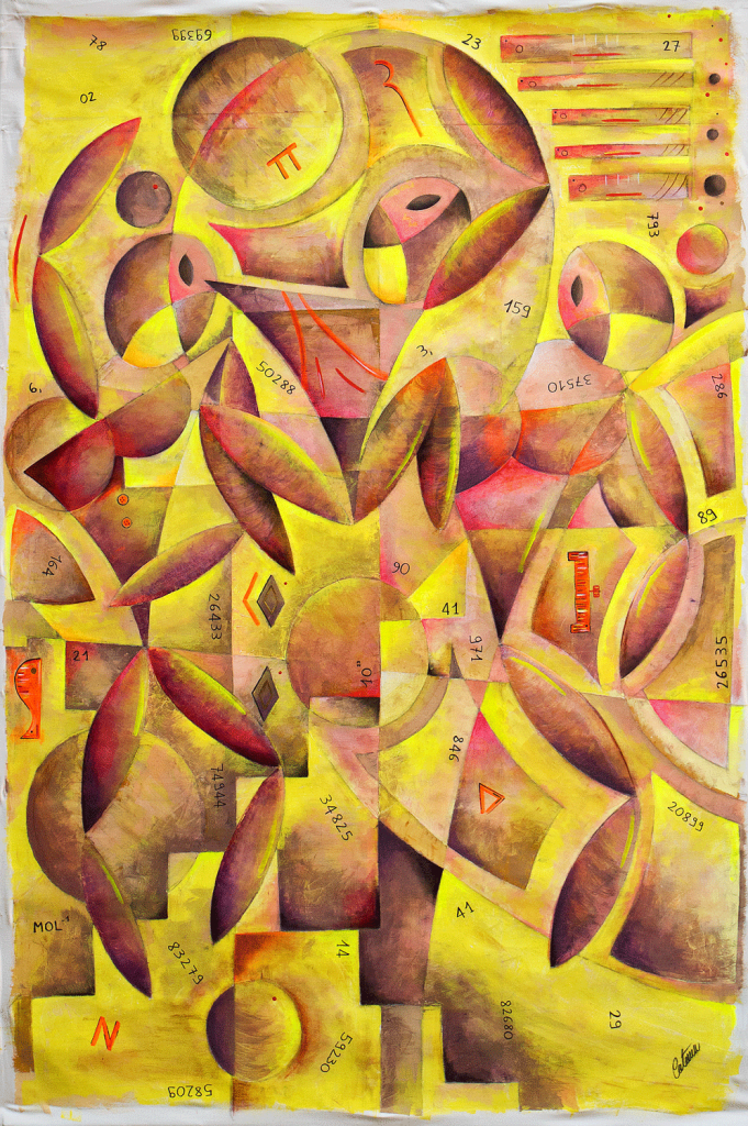 Ecco dunque che Trois Hommes, l’arazzo dipinto raffigurante Amedeo Avogadro, Pitagora e Heisemberg si discosta appena dal bozzetto, realizzato nel viaggio in treno da Parigi a Milano su alcuni biglietti del Louvre, per l’aggiunta di un dettaglio (due gambe) alla figura di Pitagora. L’opera Fenicotteri allo specchio invece, una volta conclusa su tela con acrilico, olio e colore fluo, risulta identica al bozzetto originario. E, ancora, mentre Trois Hommes è esempio di una scomposizione alfanumerica, l’opera Arlecchini, esposta nelle versioni del bozzetto, dell’arazzo di matrice cubista, della tela più informale e dell’animazione digitale, è la scomposizione figurativa di due arlecchini, uno rosa e uno giallo, agili e danzanti mentre suonano il mandolino.