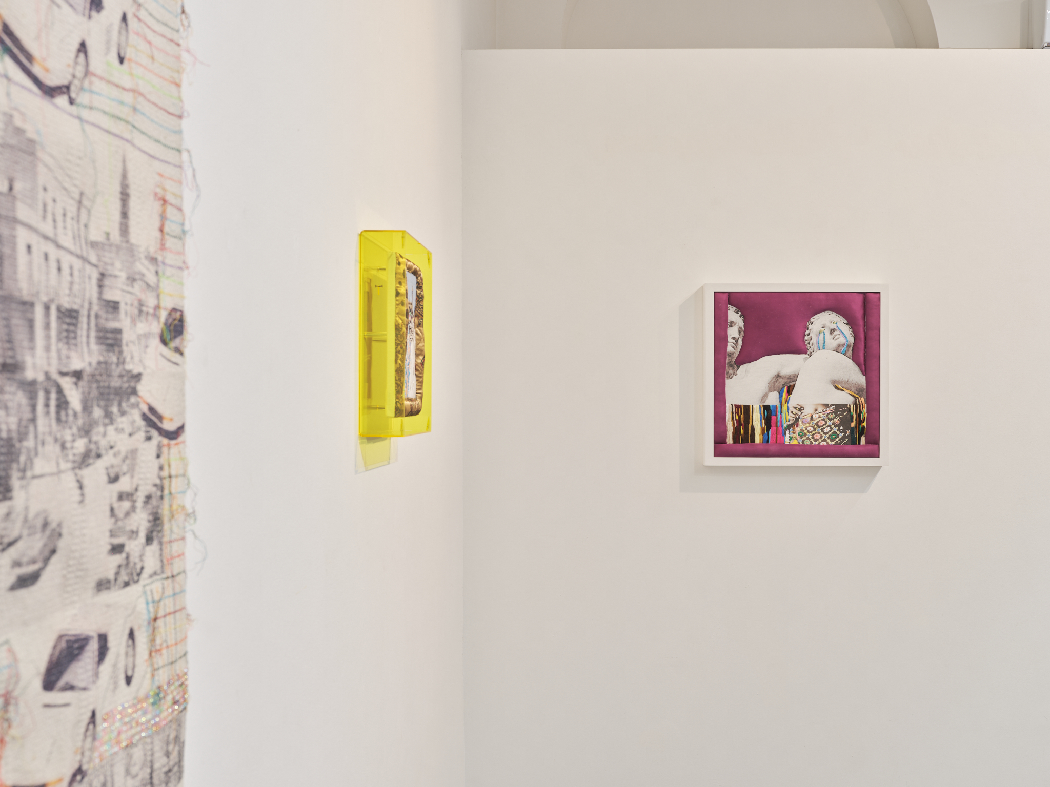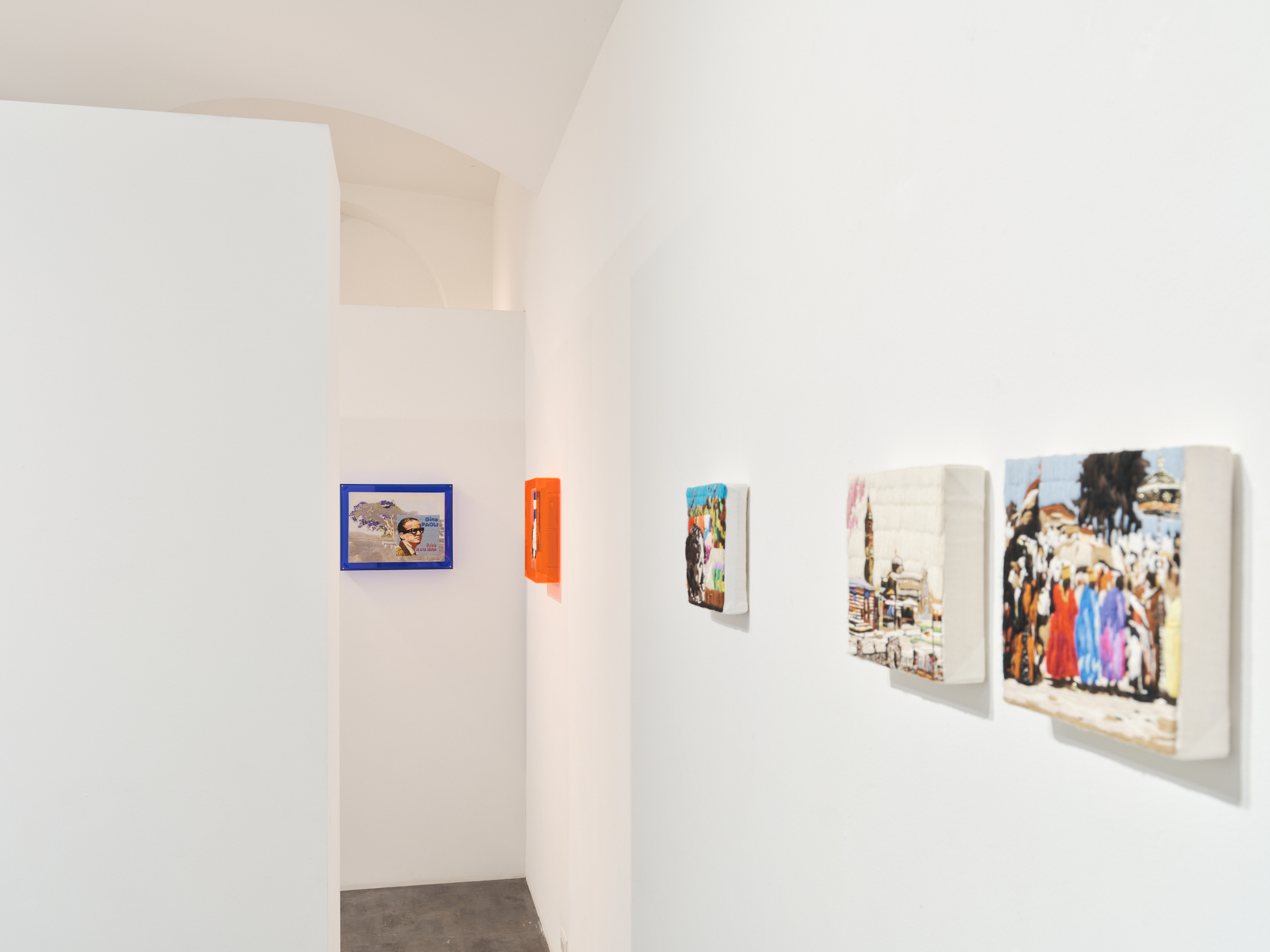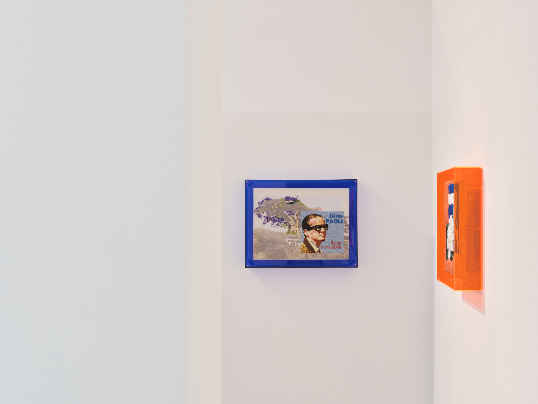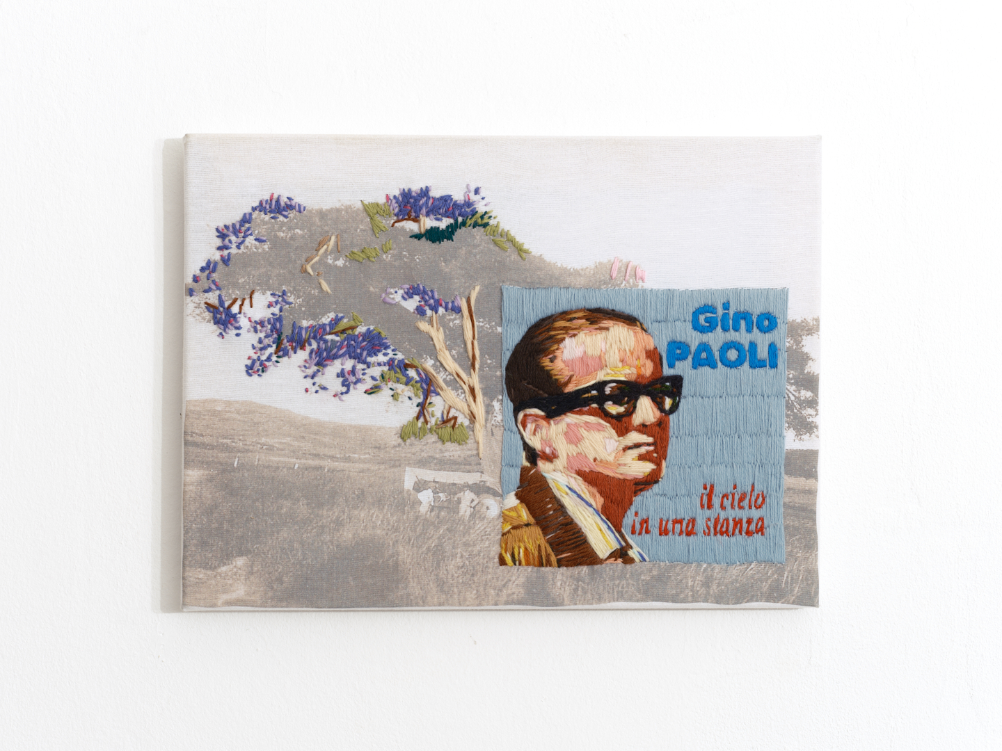 «Nel percorso espositivo, come prima accennato, viene mantenuta la chiave pop ed originale caratterizzante il lavoro del giovane artista, unita alla sua passione per il mondo della canzone ed in particolare degli anni’60 italiani e le sue figure iconiche, con un leggero senso di nostalgia. La mostra “I cieli in una stanza”, a partire dal titolo, unisce una dimensione senza tempo dell’immaginario dell’artista che vagheggia seduto all’ombra del grande sicomoro a contemplare un cielo immenso. Il ricamo anche in queste opere assume una connotazione pittorica e sembra quasi tracciare una linea temporale, accentuata dalle cornici in plexiglass studiate appositamente per ciascuna opera».
