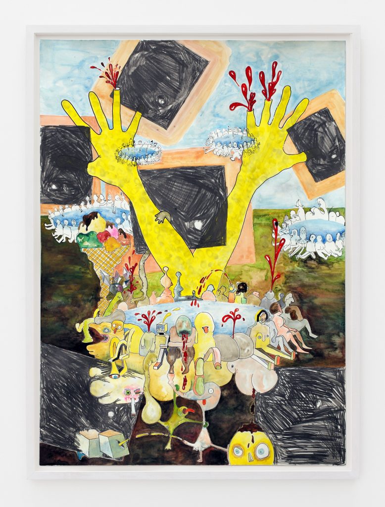 Collocata all’incrocio tra Gundrunstrasse e Sonnwendgasse, la fontana si presenta come un anello di figure umanoidi – volutamente goffe, esagerate, quasi caricaturali – i cui corpi formano il recipiente. L’acqua sgorga dalle loro mani, dalle bocche o dagli arti e ritorna nella vasca centrale, generando un sistema circolare che funziona esclusivamente grazie alla prossimità tra i corpi. In questa composizione, le figure ideate da Gelitin incarnano allo stesso tempo esseri umani e creature ibride, presenze che oscillano tra figurazione e astrazione e che, nella loro varietà, alludono alla pluralità della società. Accostati corpo a corpo, questi personaggi sembrano suggellare un tacito patto di solidarietà: solo restando uniti riescono a sostenere e a preservare l’acqua che scorre tra loro, richiamando l’attenzione sulla responsabilità collettiva nei confronti di una risorsa fondamentale per la Terra. I disegni dell’esposizione newyorkese prendono spunto da WirWasser: frammenti di quelle figure sono stati progressivamente rielaborati attraverso interventi grafici che hanno trasformato l’originaria composizione, generando ulteriori possibilità di interazione tra i corpi.