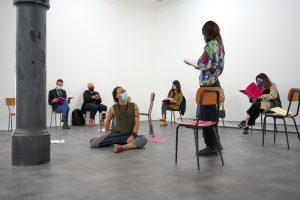 La mostra occupa i due ampi padiglioni che giganteggiano ai lati dell’ingresso. Infiliamo d’acchito quello di destra per assistere al cortometraggio Segunda Vez– una frammentata ibridazione di politica, psicanalisi e performance art – dedicato all’argentino Oscar Masotta (Buenos Aires, 1930 – Barcellona, 1979), figura di intellettuale poliforme, teorico della Pop Art e dell’happening, cultore e divulgatore della psicanalisi lacaniana nel mondo ispanico, e che provocatoriamente definiva se stesso esistenzialista, marxista e peronista. Nel padiglione prospiciente animato da alcune performance che si svolgono in contemporanea, incontriamo Dora García intenta a osservare con attenzione gli attori impegnati nella messa in scena di una delle sue ideazioni. Nel breve dialogo intercorso ci ha confermato l’importanza del testo letterario come base per l’abbrivio creativo e, segnatamente, della scrittura lacaniana che, in questo progetto romano, gioca un ruolo di primo piano. Certo, l’effetto è davvero spaesante.