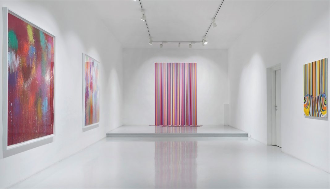 Ian Davenport e la loro storia Luca Tommasi la conosce bene perché si è da poco laureato proprio con una tesi in storia dell’arte contemporanea sugli YBA. E spiega per filo e per segno come le ‘strisce colorate’ dell’artista inglese nascono e subiscono profonde variazioni pur ripetendosi. Un po’ come i lavori storici di Philippe Glass, micro variazioni tonali, ma fondamentali nel mutare la musica e l’ascolto. «E’ una pittura ‘processuale’, si seguono i movimenti della materia mettendo in atto la colatura. Il suo lavoro – prosegue il gallerista – è un alternarsi di controllo e causalità». Si tratta dello studio e della gestione del movimento del colore materico. «C’è un intervento di controllo del processo di colatura in corso. Le sue opere sono ‘colature’ fatte con delle siringhe di colore su lastre di alluminio. Se si tratta di opere grandi si arrampica su una scala e fa l’iniezioni’ da lì». La serie dei lavori visibili a Milano si chiama “Puddle paintings”, perché alla base dell’opera si crea una pozzanghera (puddle) dove il colore si mischia. E si formano affascinanti macchie esteticamente organizzate. E’ un processo anche questo studiato. Perché Davenport tiene piegata la lastra di alluminio alla base, così il colore scivola lungo la parte in verticale e si ferma in quella orizzontale. E cambia direzione creando nuovi disegni, appunto. «La sua può anche essere definita una visione post minimalista – aggiunge – ma Davenport è uno che non smette di ricercare. Per esempio, in questi lavori ha iniziato a creare una specularità tra i due lati del quadro. E ogni tanto si diverte a fare dei tributi a grandi artisti del passato prendendo dei loro colori di riferimento e riproponendoli con il suo stile pittorico».