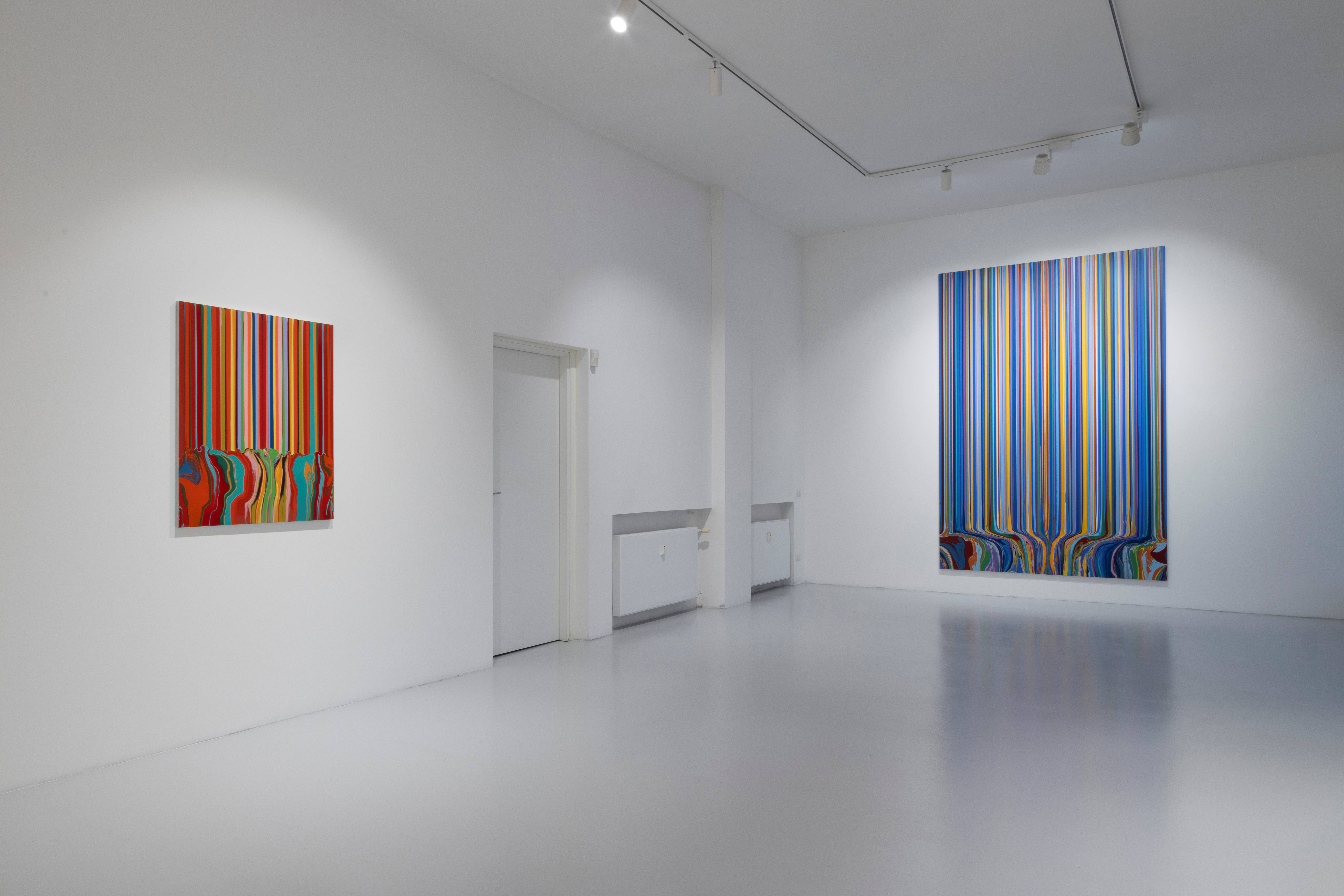 I Puddle Paintings sono le ormai celebri “cascate” di colore che hanno reso riconoscibile la cifra dell’artista britannico. Strisce verticali, perfettamente ritmate, colate di vernice lucida che scendono dal bordo superiore del supporto e, in alcuni casi, traboccano oltre il margine inferiore, espandendosi sul pavimento in pozzanghere cromatiche. Il quadro diventa una sorta di partitura e la pittura una materia che occupa lo spazio bianco della galleria, a suggerire lo stato di non finito dell’opera, sempre in formazione.