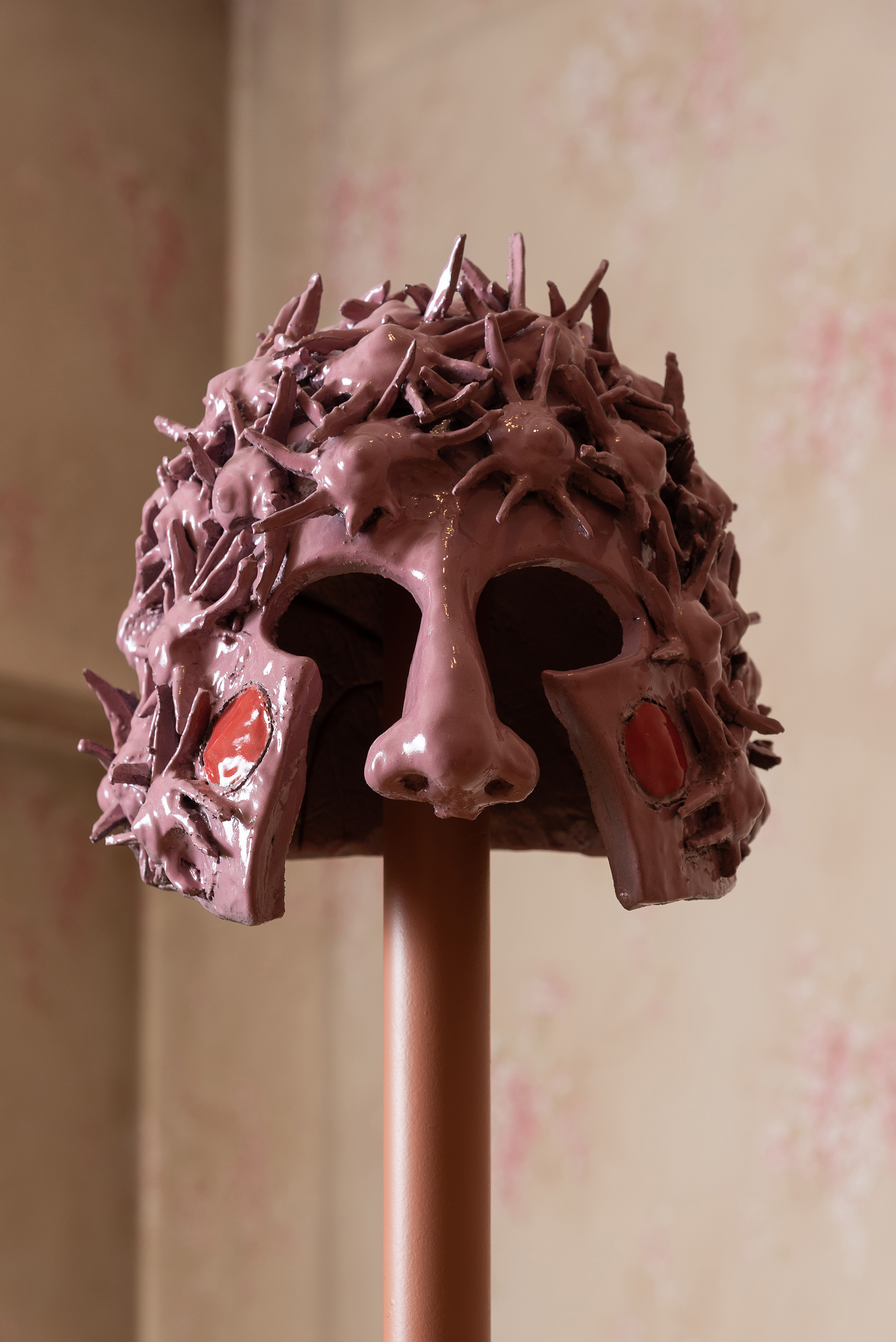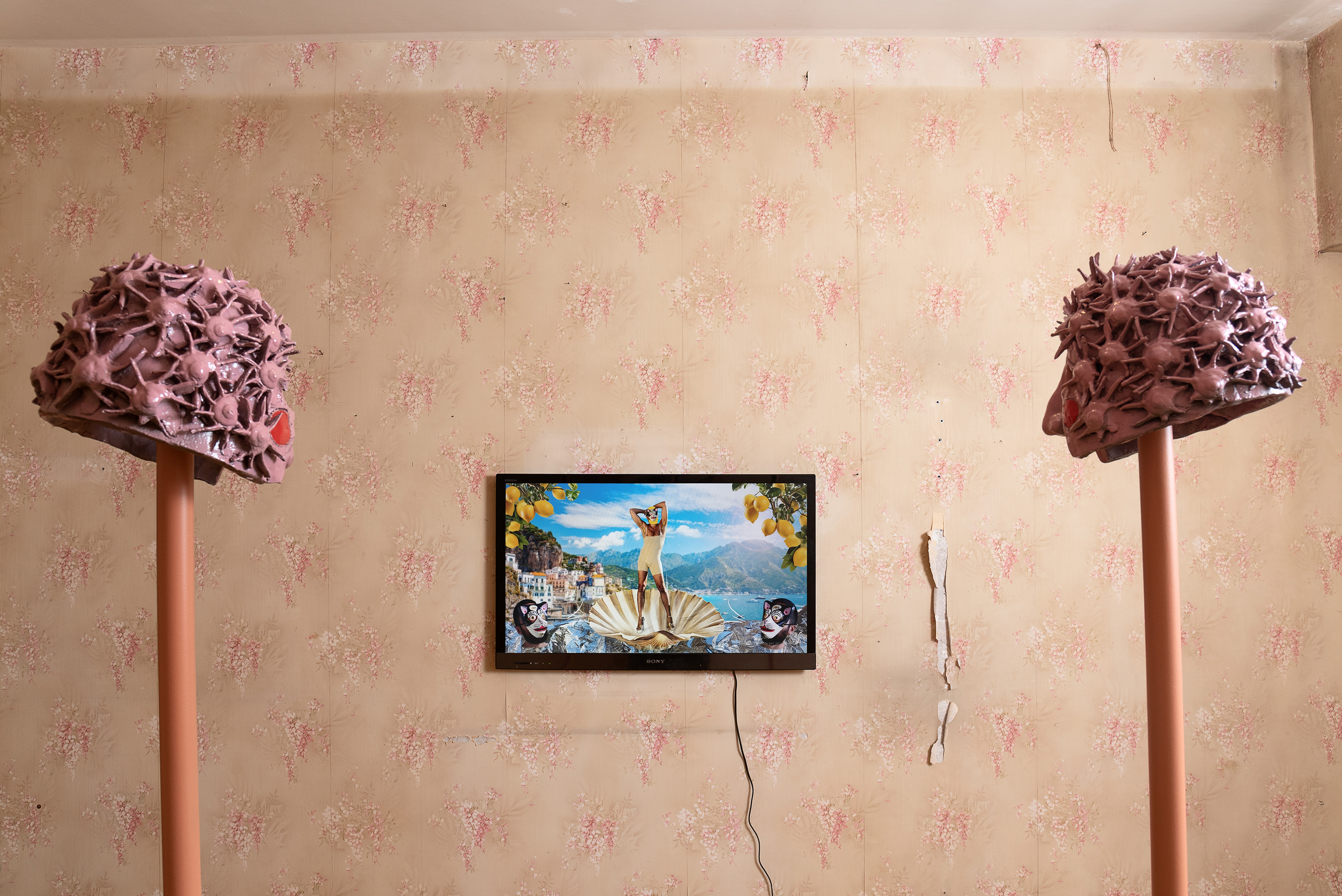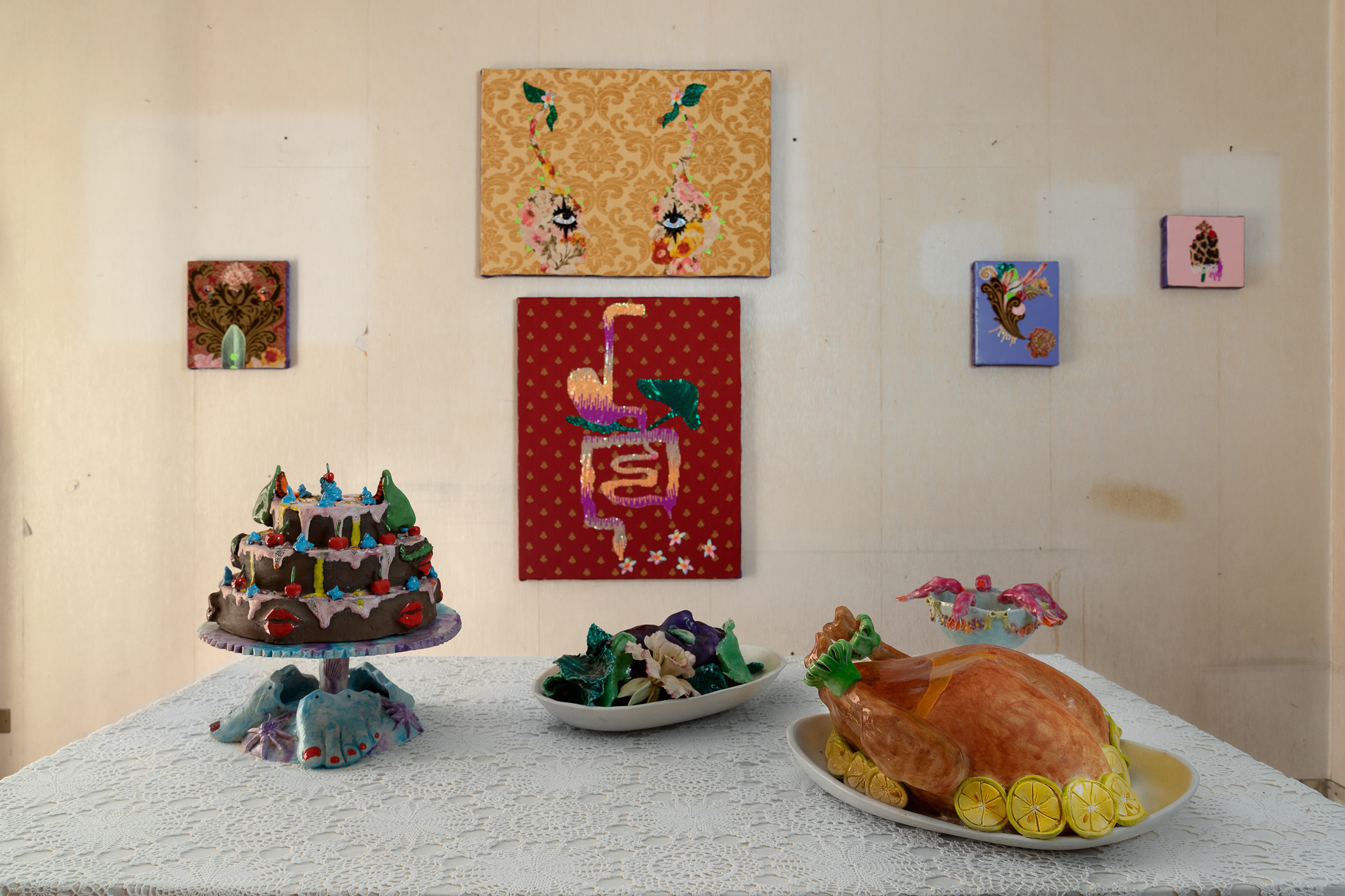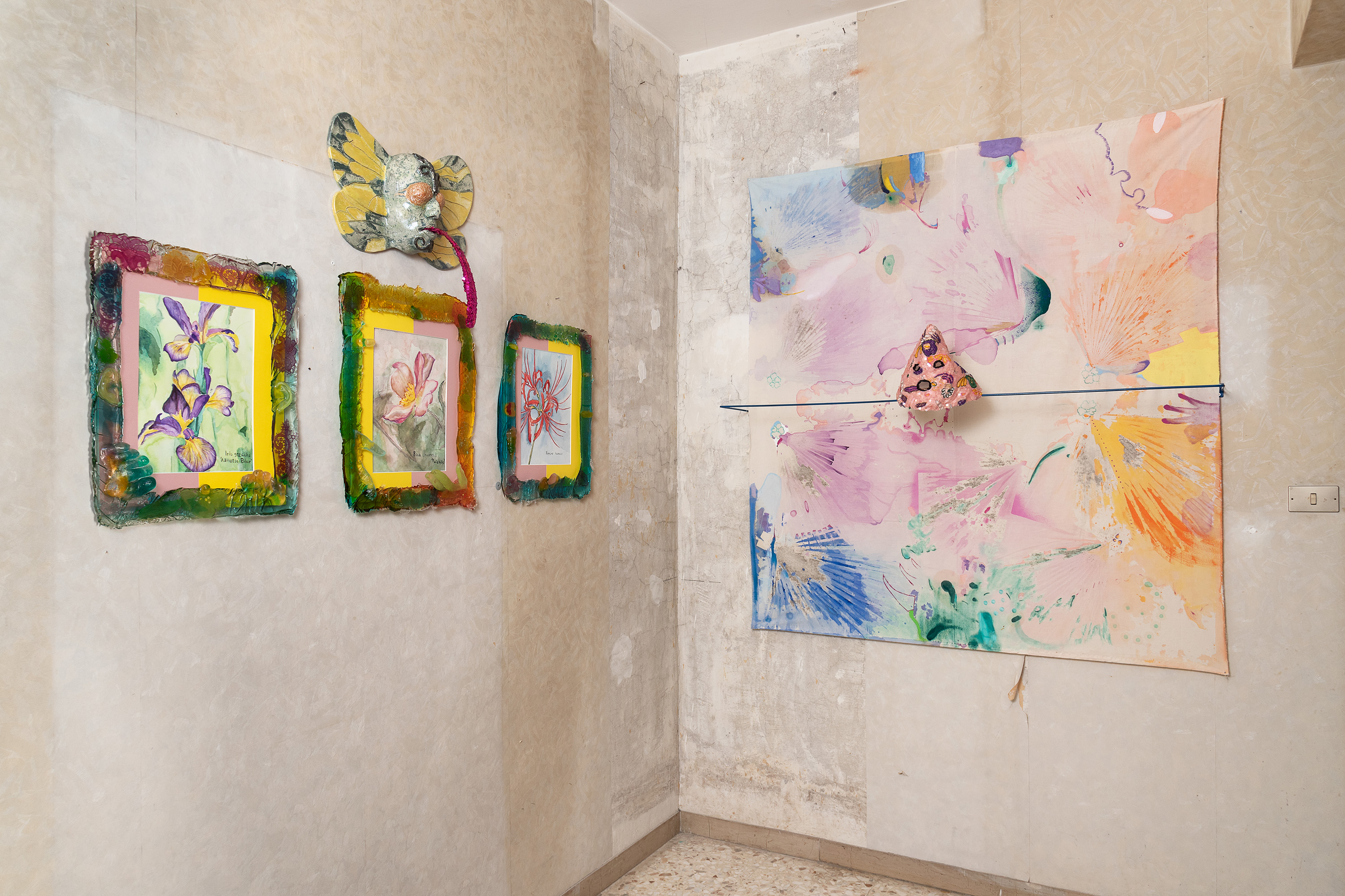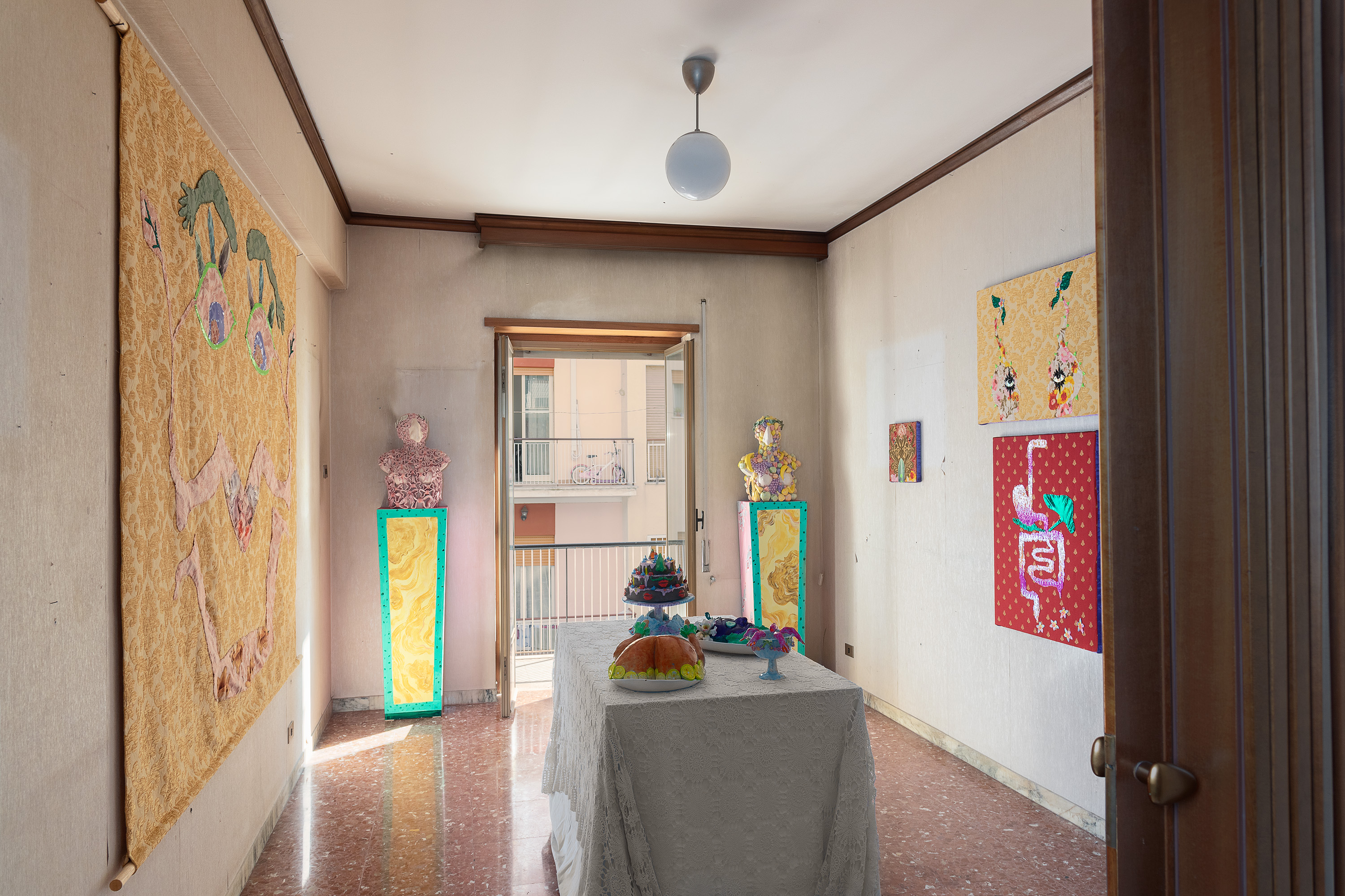 Tra riferimenti botanici e citazioni iconografiche, le ceramiche imbandite, i drappi e i ricami scintillanti, le pitture vivide e il video irridente e vivace, compongono una installazione dispiegata nelle stanze dell’abitazione che innesta trasformi fantasmagorie corporali, metafore della società, ad uno sguardo ironico verso spinte categoriali identitarie, mitologie e simbologie ad ecologie queer.