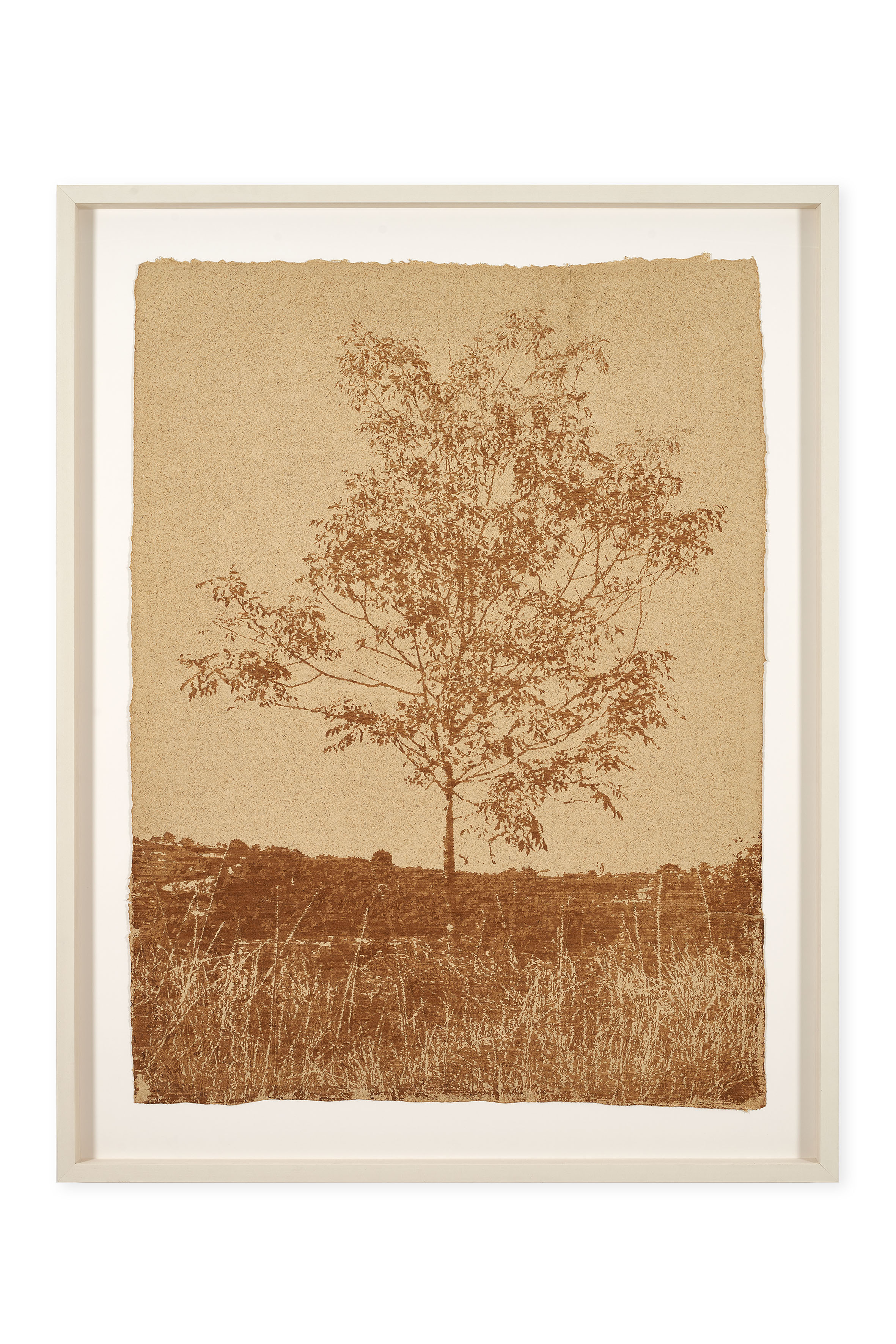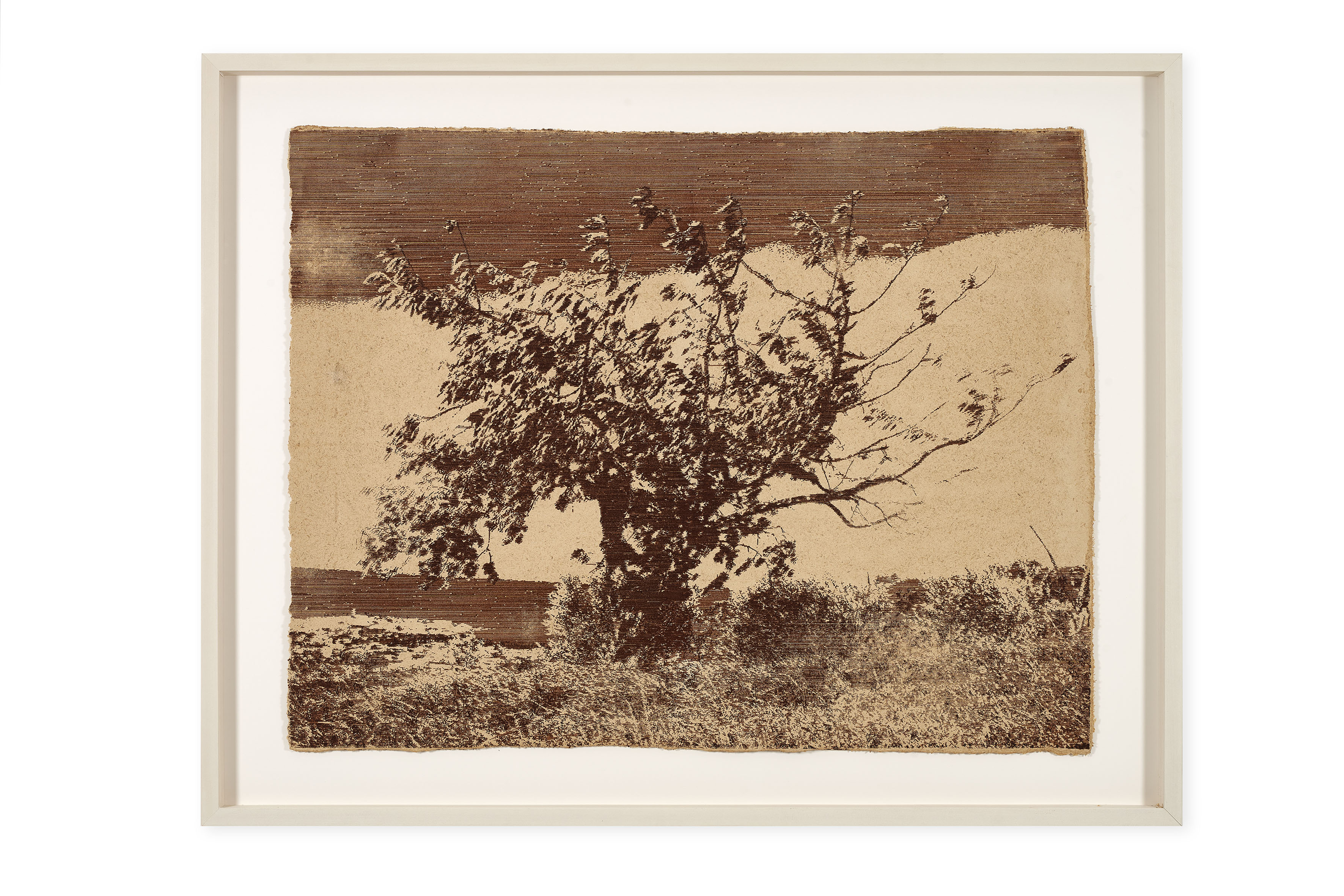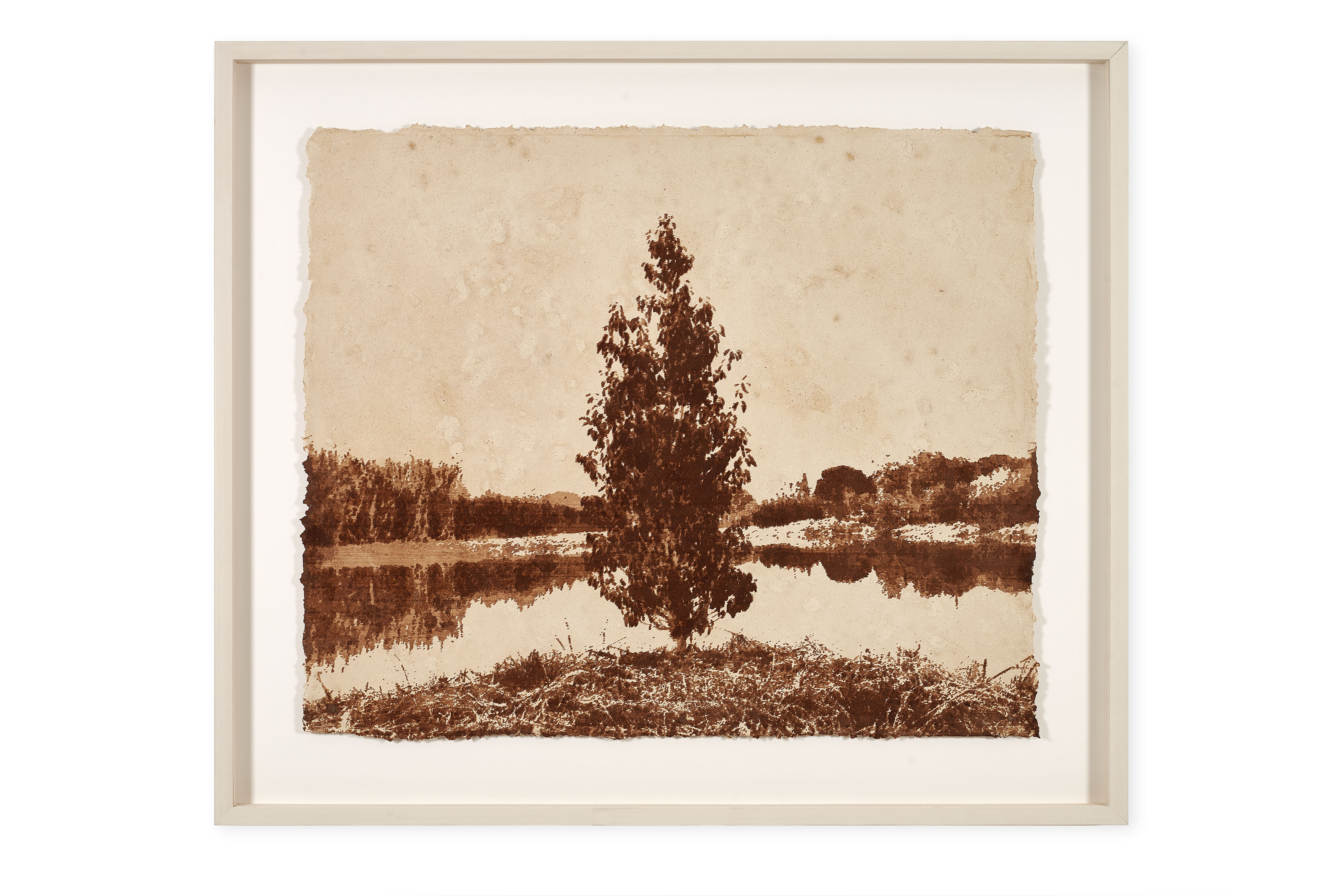 Il progetto si articola attorno a sei opere pittoriche dedicate ad altrettanti alberi – pino, cipresso, ciliegio selvatico, frassino, quercia e alloro – selezionati dall’artista nel contesto locale. Il processo che le genera è al tempo stesso radicale e circolare: gli alberi vengono fotografati, abbattuti e trasformati attraverso una lavorazione meccanica che riduce il materiale vegetale a una pasta di cellulosa. Da questa materia, Downey ricava una carta su cui interviene pittoricamente utilizzando pigmenti ottenuti dalla macerazione delle cortecce.