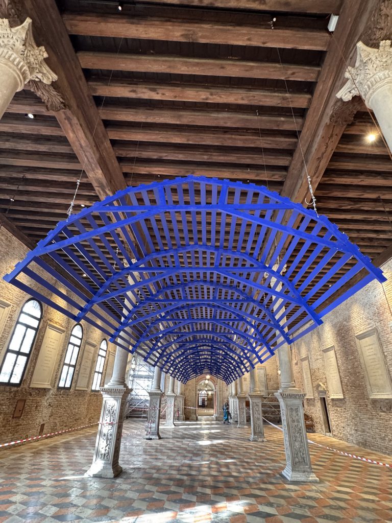 In questo contesto, l’installazione, costruita con listelli di legno dipinti di un blu oltremare saturo e profondo, si offre come architettura simbolica, un invito a riformulare il rapporto tra corpo, ambiente e trascendenza. Allestita nella storica sala di accoglienza della Scuola di San Marco — spazio di relazione nell’Ospedale ottocentesco e di comunicazione culturale nel Museo odierno— l’installazione ha come punto di partenza l’idea che un luogo dedito alla cura e alla salute non possa tralasciare un certo riguardo per lo sguardo e per lo spirito.