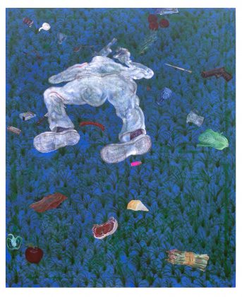 Come nelle mele di Forbidden fruit (2023), dell’ultima produzione ceramica dell’artista realizzata appositamente per l’esposizione a Matèria. Le mele in ceramica se da una parte ricordano l’immaginario vignettistico – come i fools – dall’altra ci fanno pensare all’emoticon. Sono mele un po’ pazze e sghignazzanti che ridono, chissà, delle fatiche di Sisifo dei fools il cui disagio finisce solo quando sono KO. Come il Common Saint (2022) che giace steso a faccia in giù in un prato, facendo il gesto di un “ok”. È la santificazione del perdente, di quell’antieroe al limite tra normalità e marginalizzazione che ci racconta Runo B.