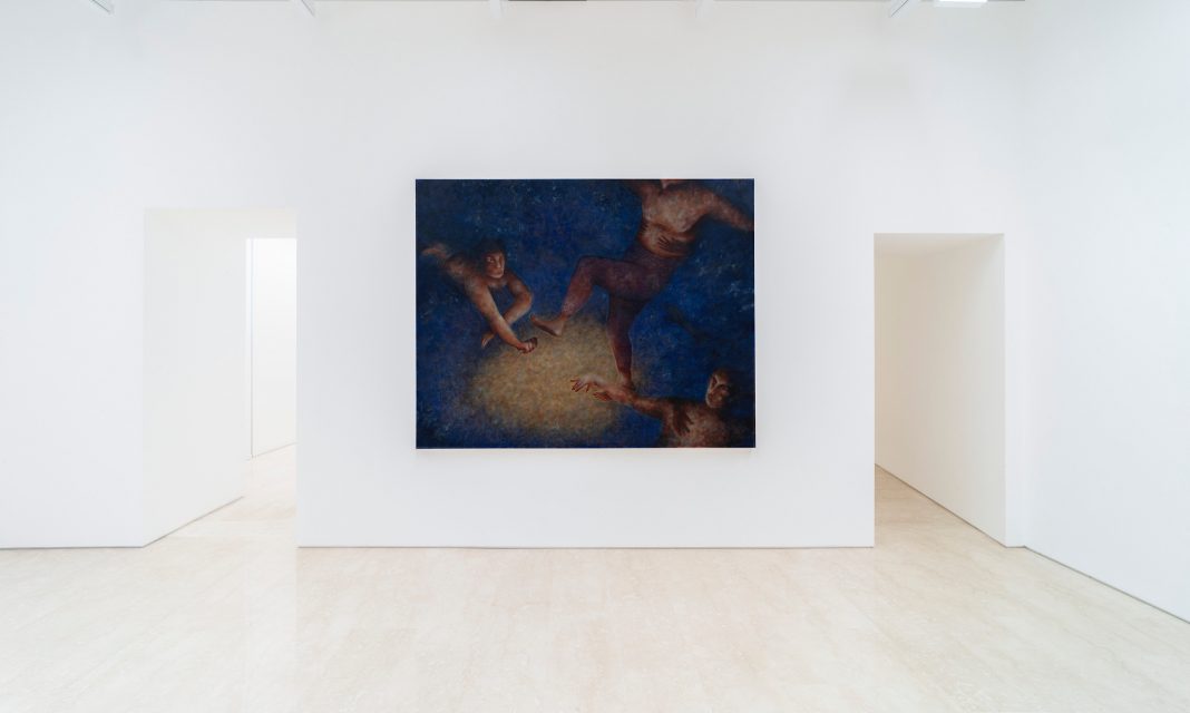 È questo il caso anche della grande pala d’altare che ci accoglie all’inizio del percorso: Maramèo (2024). L’opera, pensata appositamente per la nicchia all’entrata dello spazio, si arricchisce di riferimenti alla storia dell’arte sacra: sembra una deposizione, ma il corpo che vediamo a terra è più vivo che mai e attira le occhiate curiose dei personaggi che lo circondano —e il nostro.