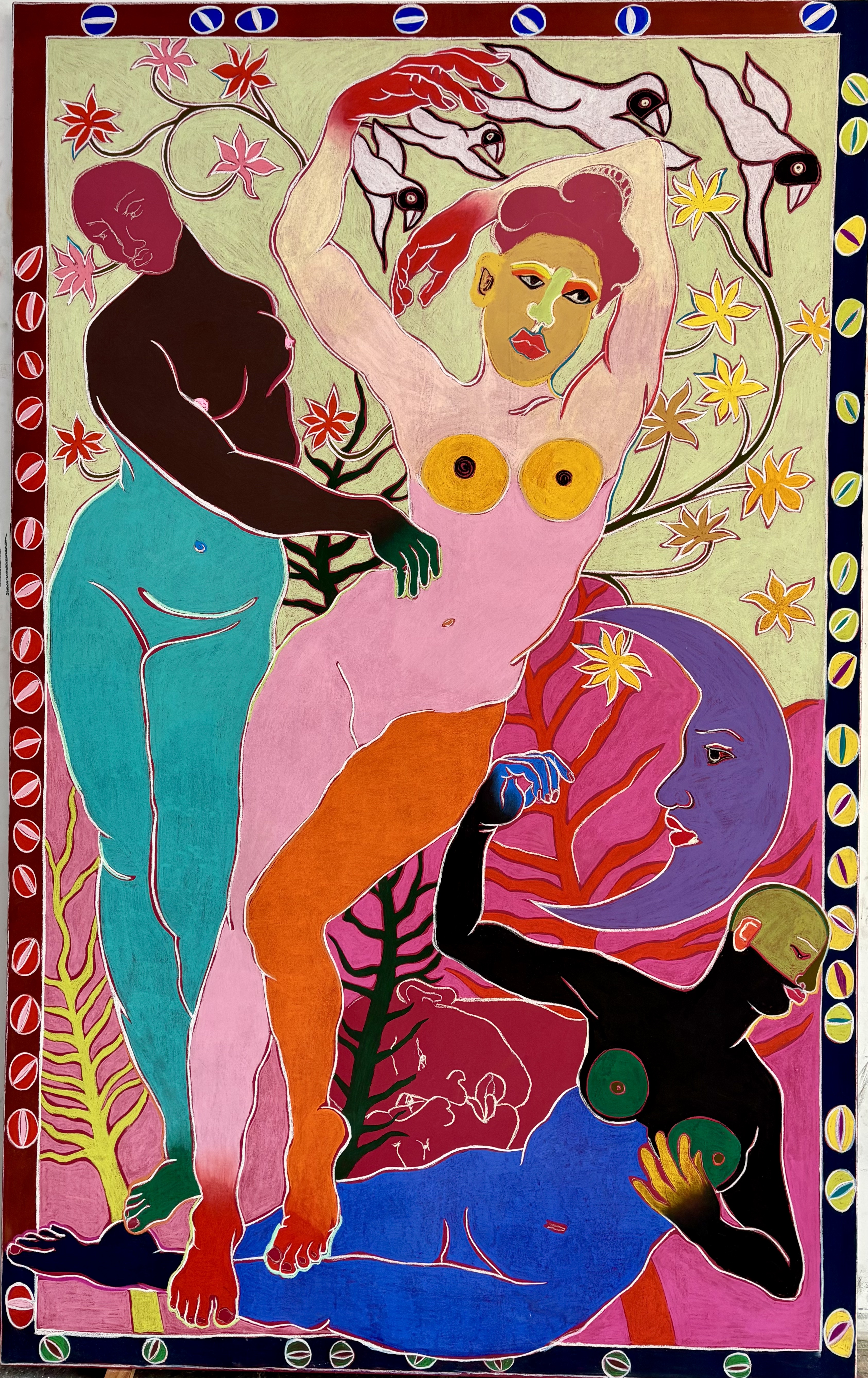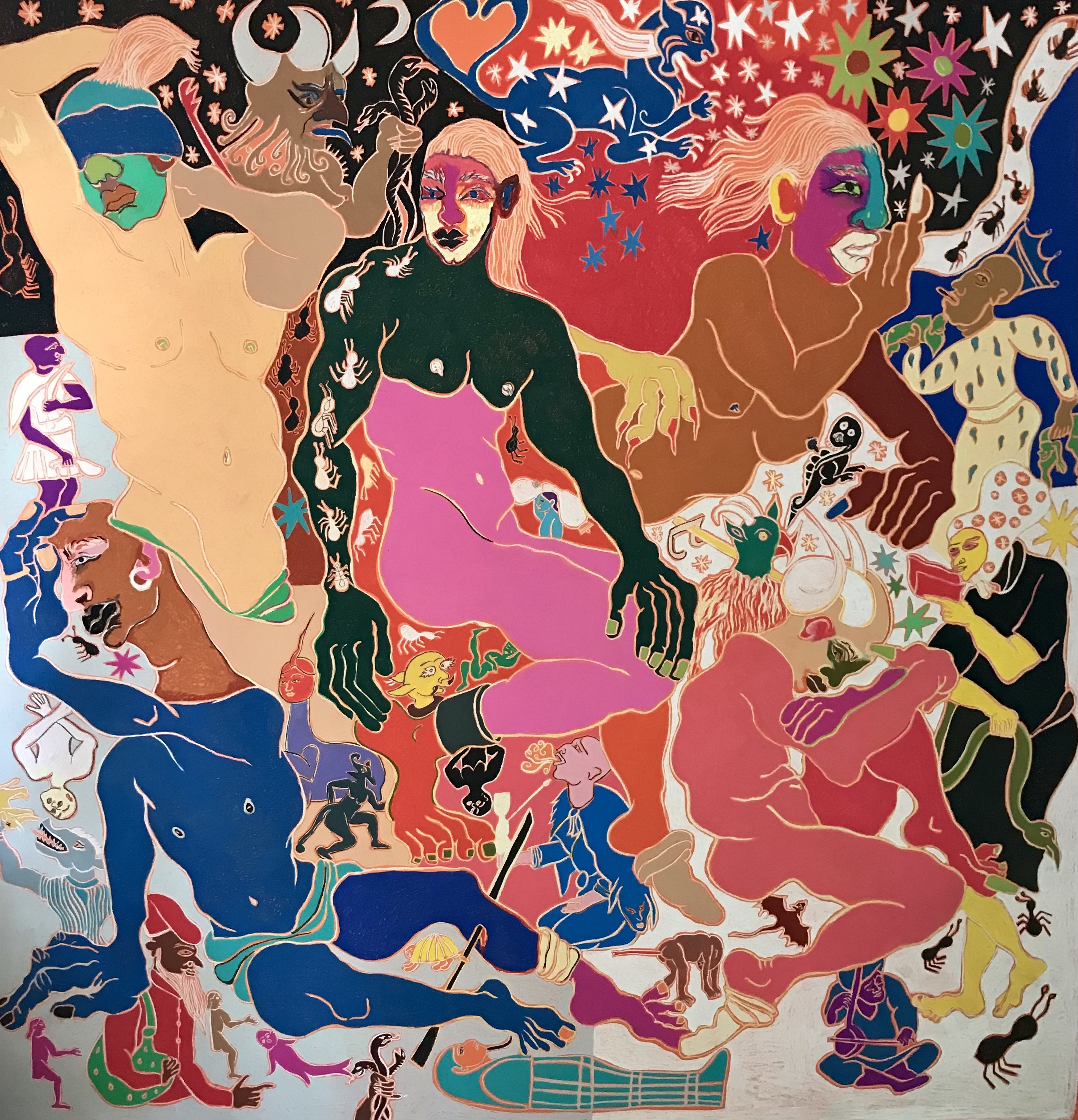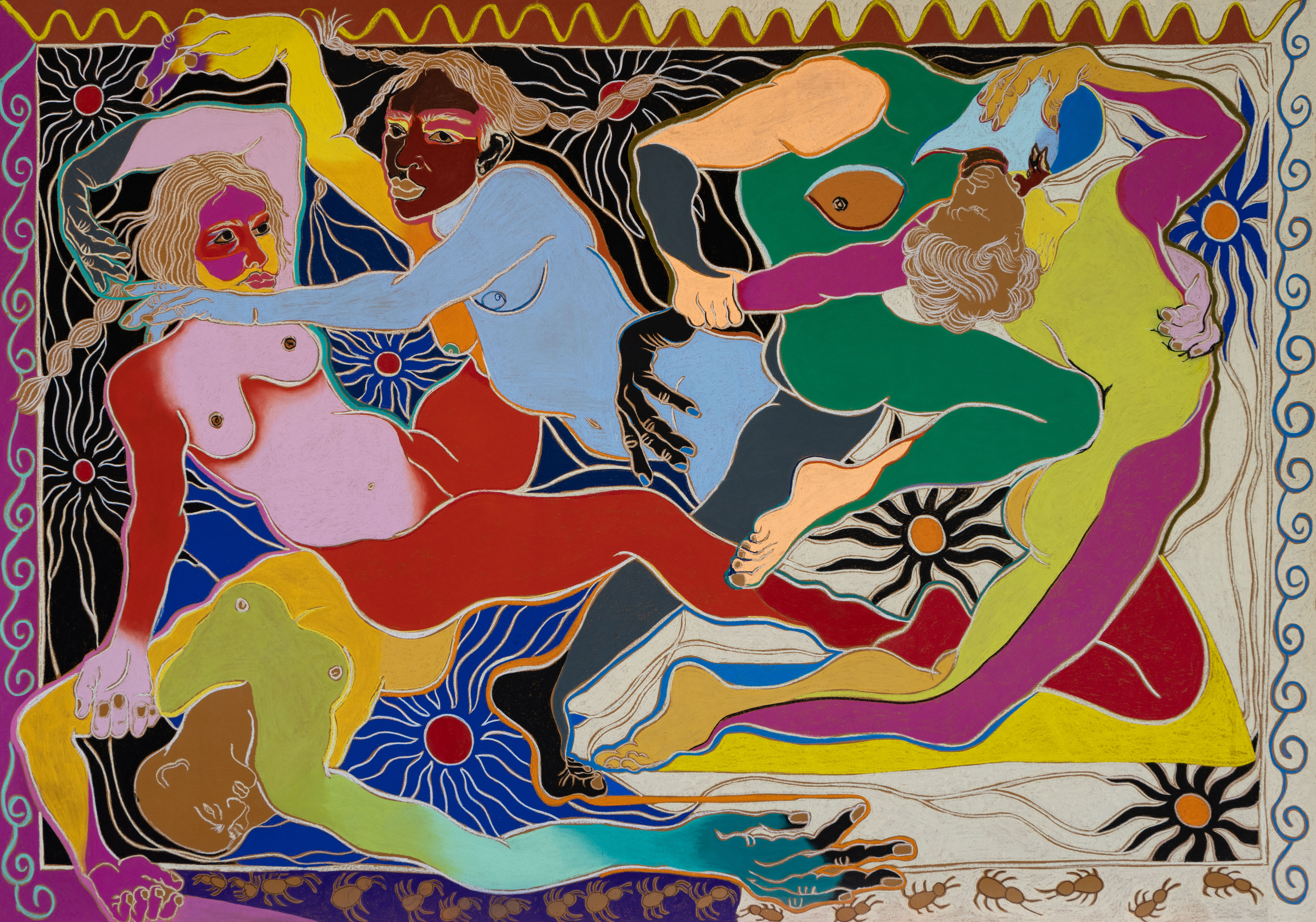 Al centro della pratica di Viau si colloca la figura umana, declinata in composizioni dense e stratificate. Corpi intrecciati, scene sovrapposte e frammenti narrativi costruiscono una trama visiva che richiama tanto la coreografia quanto il montaggio cinematografico. Le immagini appaiono come sequenze sospese, in cui ogni gesto suggerisce una tensione, un ritmo, una possibile deriva narrativa.