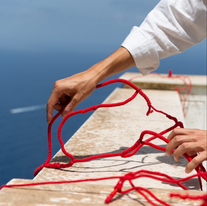 Secondo un’antica e romantica leggenda giapponese, ognuno di noi nasce con un filo rosso legato al mignolo. Lo chiamano il filo del destino, quello che unirebbe le persone destinate ad amarsi. Guardando una delle sculture fitomorfe in filo di Roberto Maria Lino, in mostra fino al 22 luglio nella splendida cornice di Villa Lysis, a Capri, viene da pensare che l’artista voglia creare questo legame viscerale proprio con il mare.