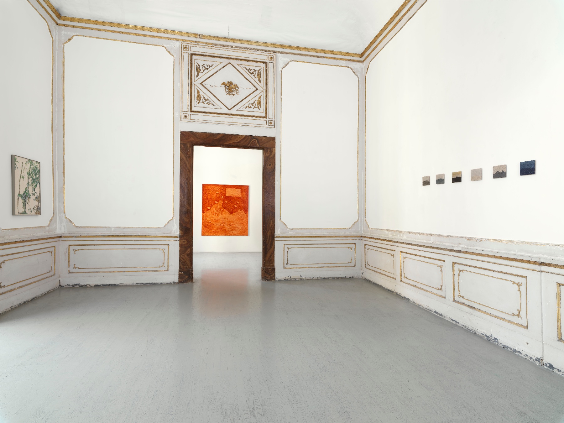 Qui, ai piani nobili, le radici faticherebbero a congiungersi con il terriccio. Le piante appassirebbero per mancanza d’acqua e di luce. Qui il Sole batterebbe senza pietà sulla nuda pietra. E così il grigio damascato di Dama-scena (Jonsson Qi, Dama-scena, 2024), l’arancio agrumato di Risveglio con limoni (Andreas Zampella, 2023), la pece acrilica di Chiarore (Paolo Bini, 2024) e la terra d’ombra di Pianta velata (Andreas Zampella, 2024) risvegliano le pareti, per farne piccoli e raccolti giardini personali.
