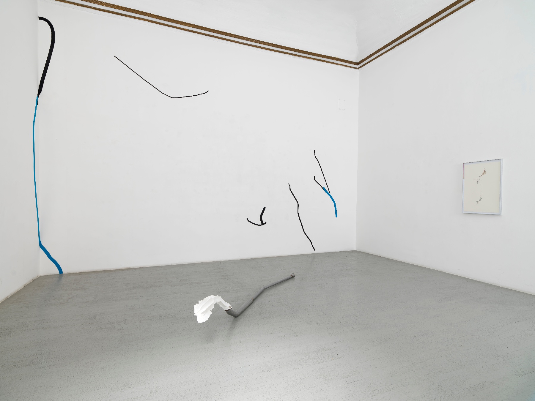 La mostra si apre simbolicamente con quella che sembra una cancellata, una porta misteriosa (Paolo Bini, Attesa, 2017-2024), che nonostante la sua forza e la sua incastellatura cromatica si schiude, aprendoci la via a un piccolo, intenso, viaggio. Incontriamo così lavori di confidenza e raccoglimento, silenziosi nella loro tenue presenza. Il protagonismo dell’assenza e del bianco (Nina Jonsson Qi, Aria, 2024), che si stagliano nell’intimità di pochi tratti porpora e cerulei. Come pensieri essenziali, da dedicare a pochi sapidi amici.