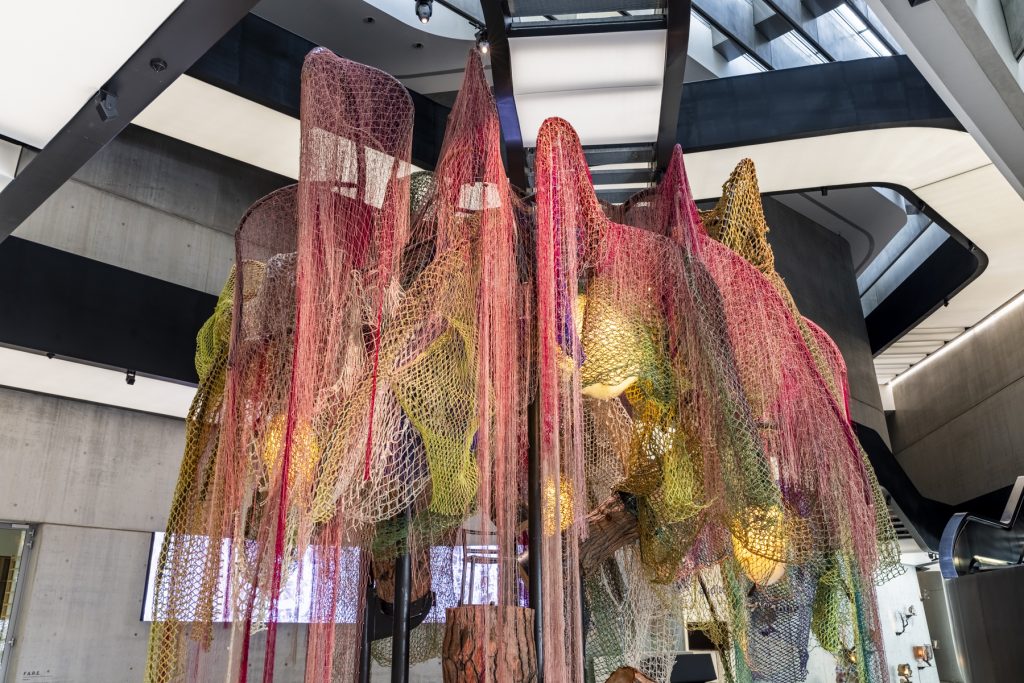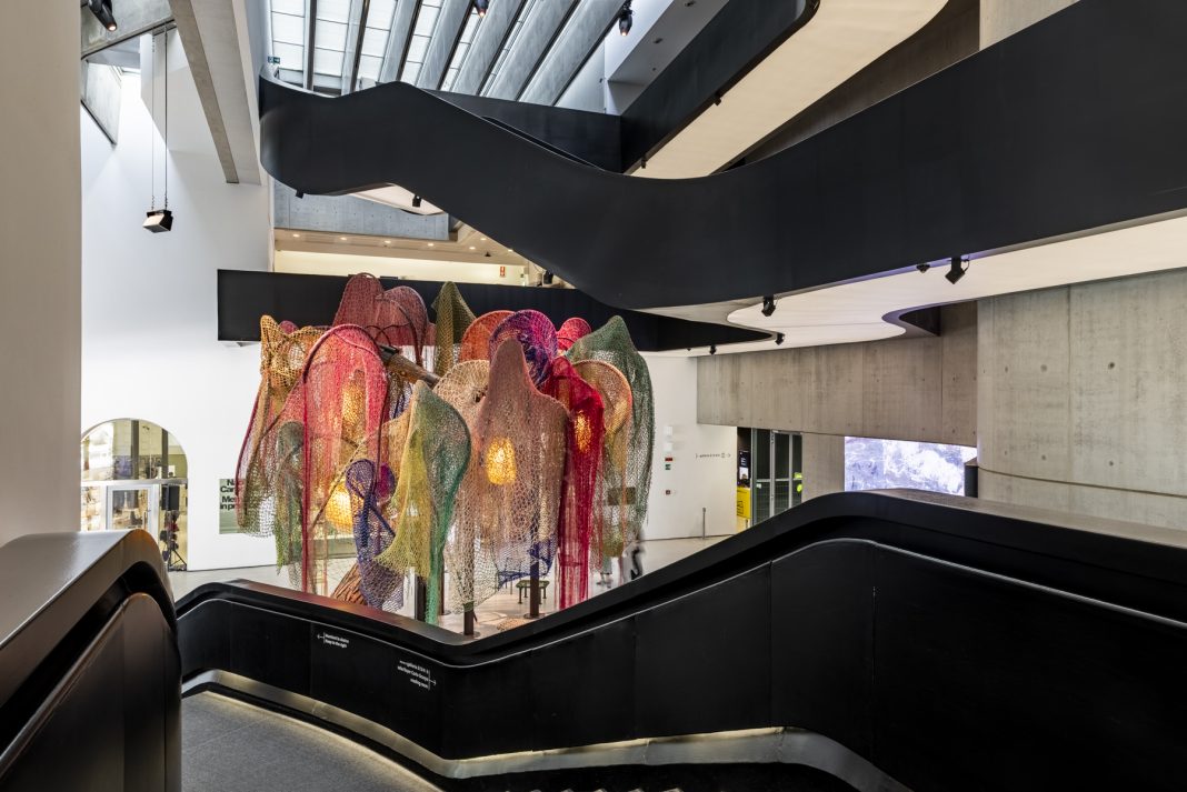 Con la stessa attenzione alla fusione di elementi naturali e artificiali, il designer Nacho Carbonell espone sulle pareti curve interessanti lampade, che culminano con un’altra inaspettata installazione composta di tavoli e sedie dal sapore di cartapesta in uno spazio poco utilizzato dal museo, conferendogli la giusta dignità originaria.