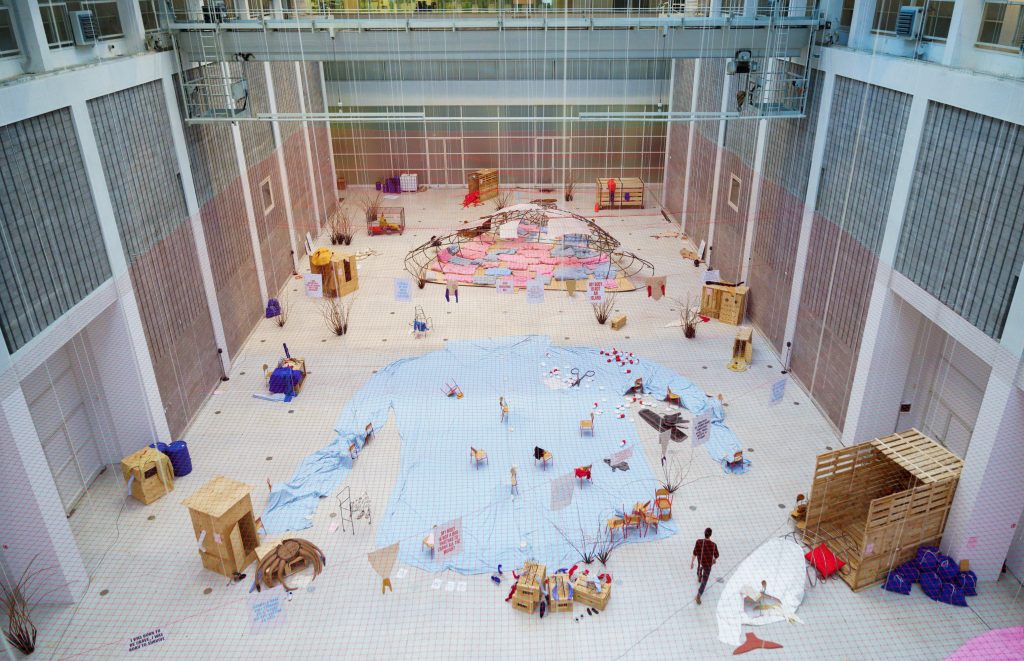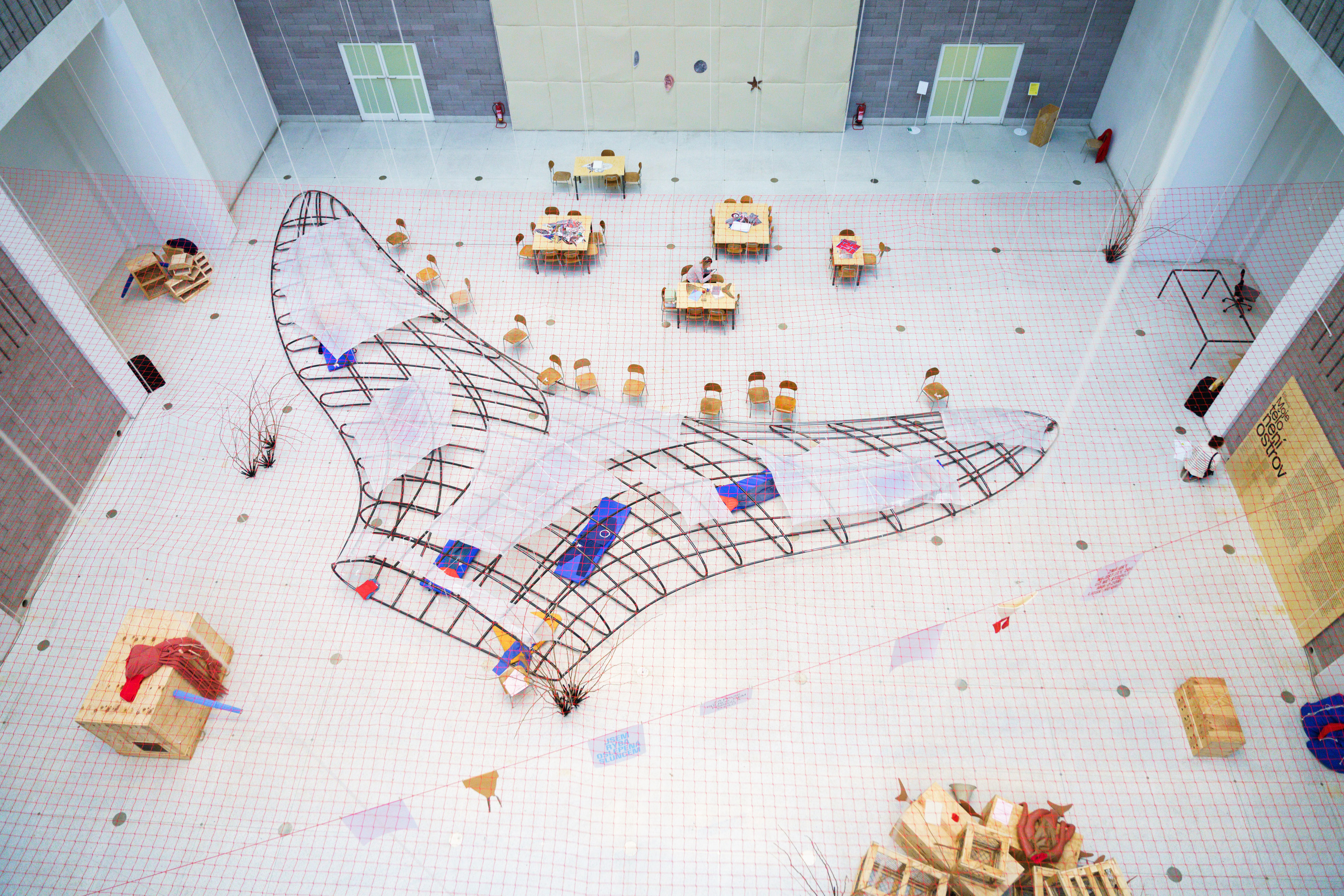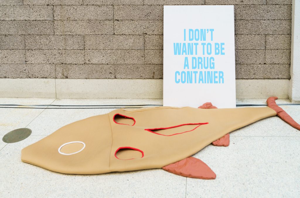 Nella Great Hall, occupata da “Il mio corpo non è un’isola”, sembra che qualcosa sia appena successo, come se una classe di bambini si fosse appena disfatta dei costumi di carnevale o di pupazzi enormi. Lo spazio espositivo è disseminato di postazioni, in tutto 21, che insieme compongono la sagoma di un corpo in parte umano e in parte pesce. Ogni postazione racconta una storia raccolta o inventata dalla stessa artista e poi trasformata in materiale audio riprodotto in sala. Oltre al paesaggio sonoro se ne aggiunge uno visivo molto colorato e bizzarro: pantaloni caudati, casse di legno con braccia, tentacoli, pinne… Decine di costumi di stoffa sono adagiati in casse da spedizione, quasi sempre accompagnati da scarpe da ginnastica. Il motivo della cassa da spedizione ricorre spesso: è il simbolo sia del movimento e del trasferimento che della normatività, della codificazione. Proprio per questo i corpi sono sistemati in modo che evadano da queste casse, adagiati tra dentro e fuori. Ogni sabato pomeriggio alcune performer danno vita a queste creature di stoffa, indossandole e raccontando dal vivo la storia del personaggio.