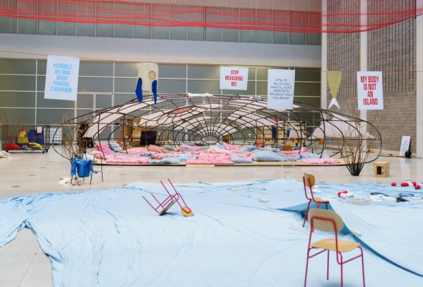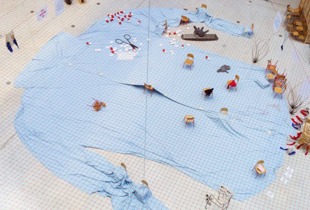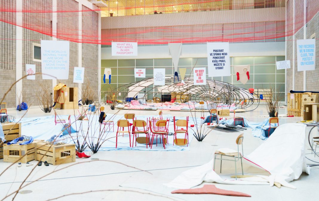 La mostra di Eva Koťátková è allestita fino al 4 giugno 2023 all’interno del Trade Fair Palace di Praga (Veletržní Palác), un edificio in stile funzionalista che ha attraversato diverse fasi nella sua storia: da luogo di esposizione fieristica a centro di smistamento durante l’occupazione nazista, fino a diventare oggi sede della Galleria Nazionale della città. La Great Hall è una sala molto ampia in cemento a vista spesso destinata ad un singolo artista che può impiegare lo spazio a sua discrezione. Quest’anno è stata occupata dall’opera di Eva Koťátková, una delle artiste ceche più riconosciute a livello internazionale, che vanta opere conservate nelle collezioni del MET e del MoMA di New York. I curatori sono Sandra Patron, direttrice del Museo di Arte Contemporanea CAPC di Bordeaux (luogo dove era stata precedentemente allestita la stessa mostra) e Rado Ištok, curatore della collezione di Arte Moderna e Contemporanea di Praga.