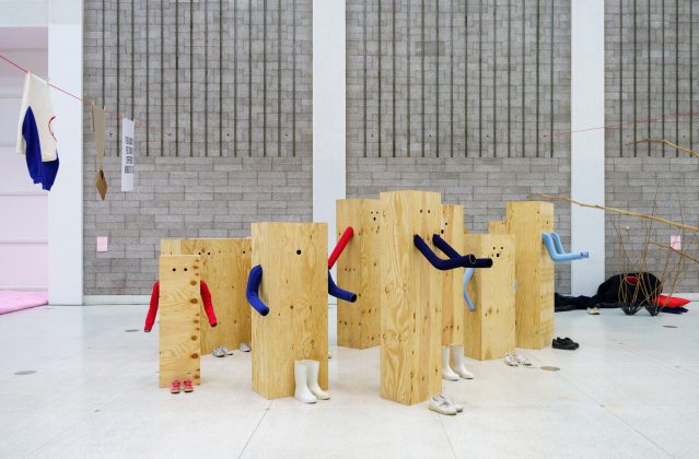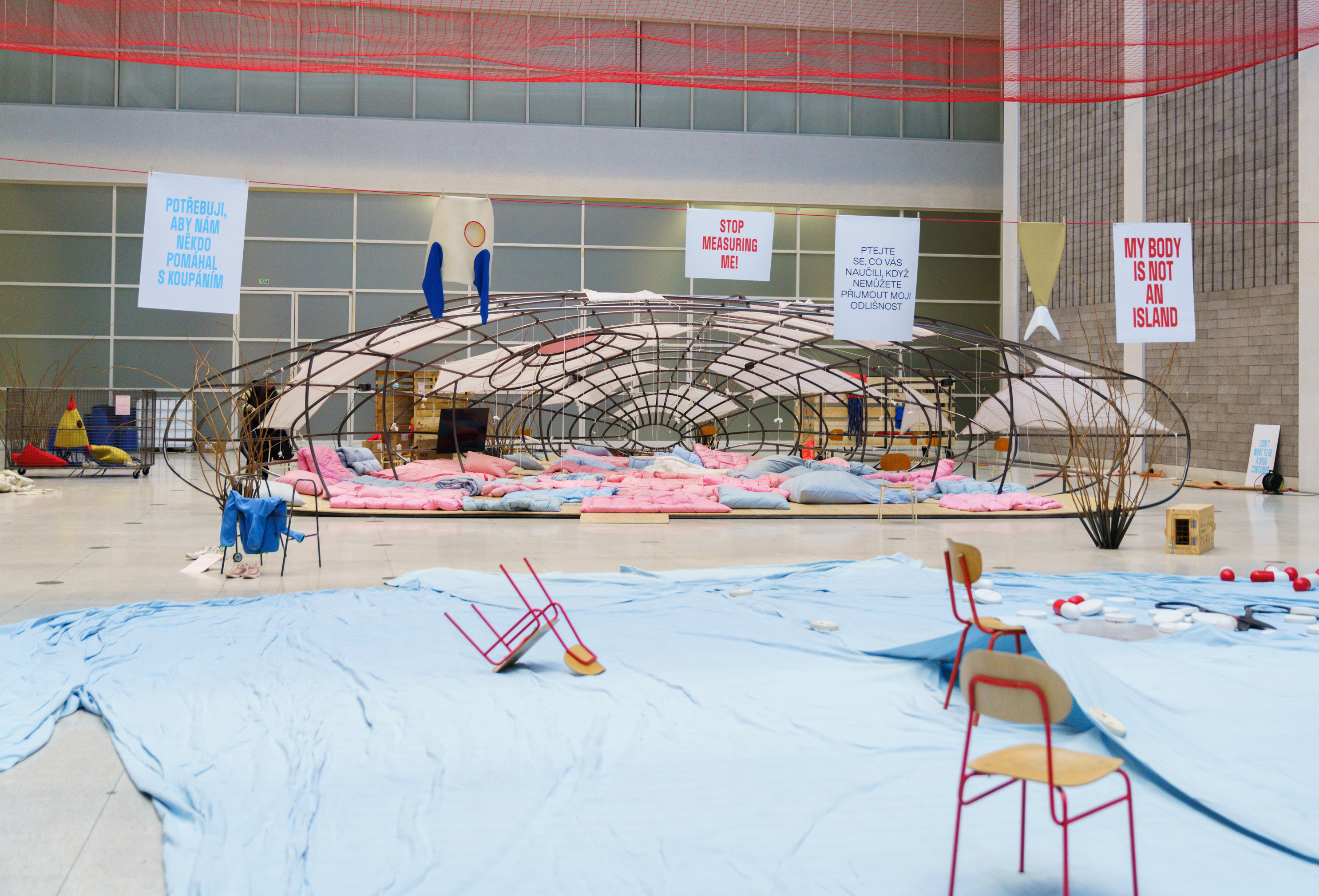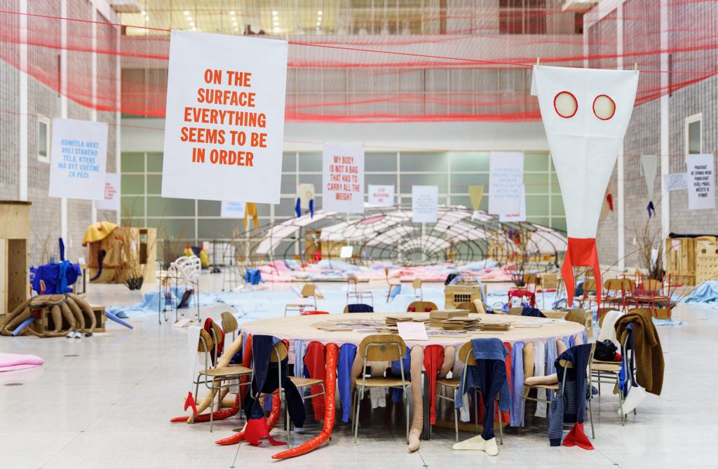 Al centro della sala un tavolo rotondo, con tante sedie quante paia di scarpe da ginnastica, tentacoli di peluche e maniche di camicie tutte diverse. Questa postazione si chiama Collective Body, e sottolinea la multiformità dei corpi, raccontando della necessaria interconnessione tra i corpi umani e non, che oggi più che mai assume significato, soprattutto dopo la globale esperienza pandemica. Servendosi dell’immagine dell’isola, l’opera di Eva Koťátková mostra come quanto la storia di un corpo maltrattato o escluso possa oggi connettersi ad altre storie di corpi che hanno vissuto un’esperienza simile, permettendo l’identificazione attraverso le sue sculture tessili e le storie che racconta con giocosa delicatezza.