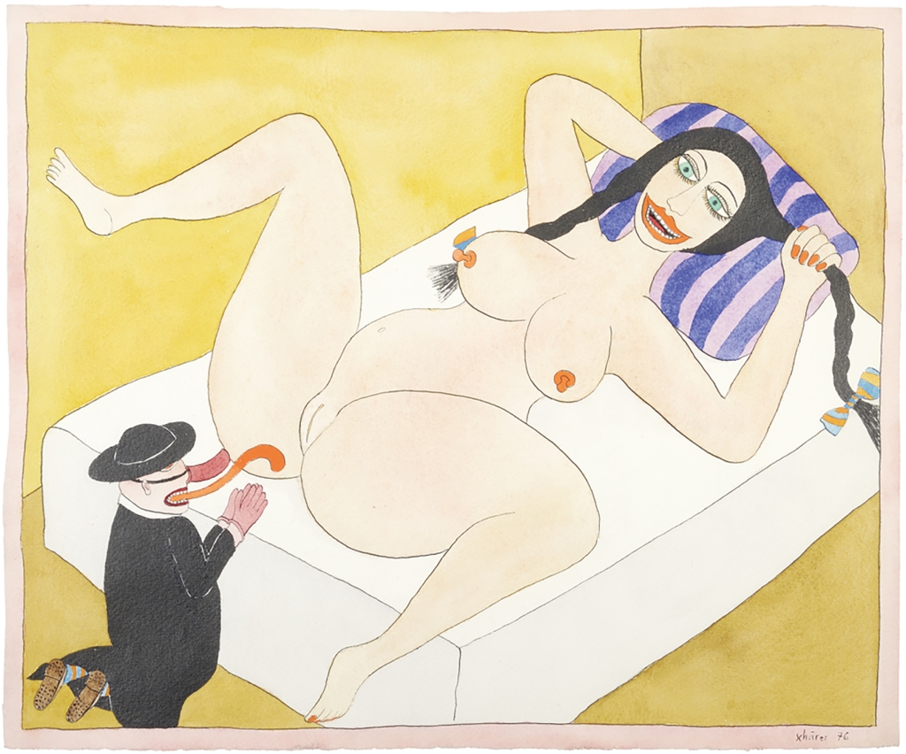 La sensualità prende una piega sorprendente con gli Erotic Watercolors di Hans Schärer dipinti tra gli anni Sessanta e Ottanta. Qui l’erotismo non seduce né scandalizza, piuttosto gioca, teatralizza. Le figure femminili, ampie, vitali, spesso gigantesche rispetto alla scena, dominano con autorevolezza ironica, mentre gli uomini — piccoli, buffi, marginali — diventano strumento di un racconto che ribalta gerarchie e immaginari fin troppo consolidati. Grazie alla leggerezza formale dell’acquerello, ai colori traslucidi e brillanti tipici degli anni Settanta, e a un tratto asciutto che ricorda i fumetti, Schärer costruisce un erotismo che è rito condiviso, spiritualità carnale e soprattutto liberazione dalla rigidità tradizionale dello sguardo e della posizione maschili.