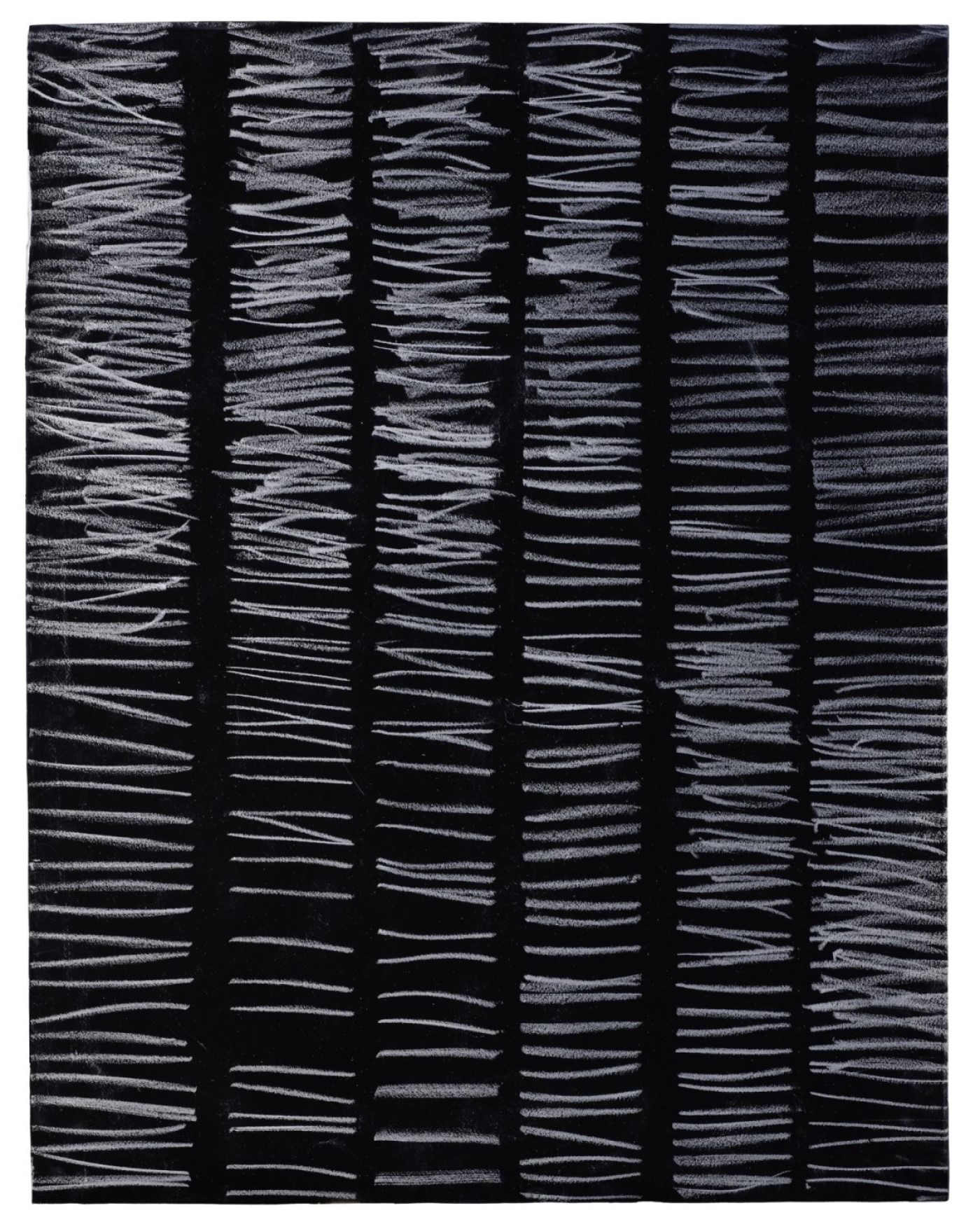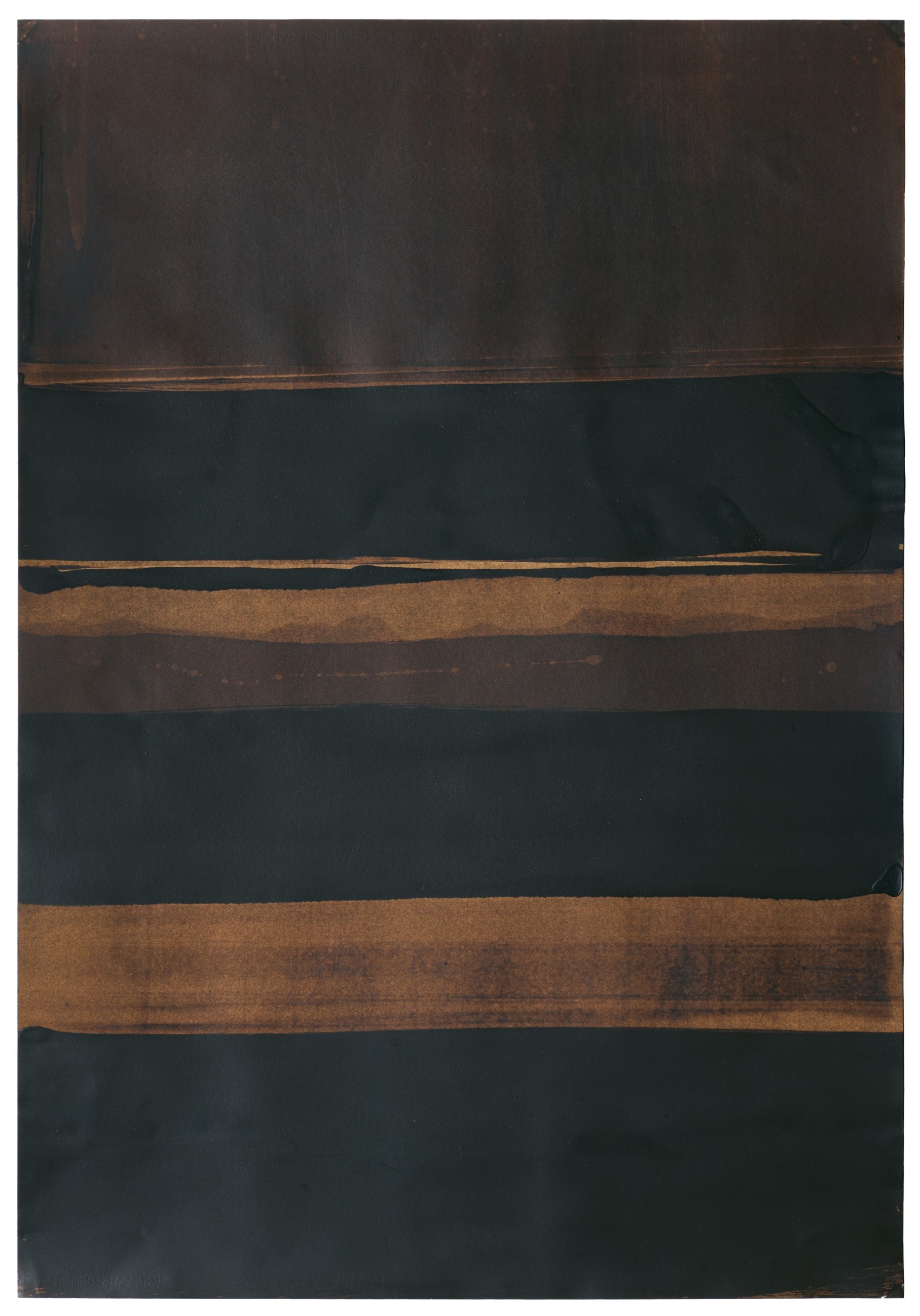 Molte opere su carta, rimaste a lungo nello studio dell’artista, appaiono oggi come un archivio segreto della sua ricerca, una mappa che permette di leggere l’evoluzione del suo linguaggio. Il brou de noix, materia prediletta e più volte ripresa, è protagonista assoluto: liquido caldo, capace di oscillare tra trasparenza e opacità in un contrasto netto col bianco della carta, sembra fatto per la dialettica di una pittura che usa un materiale povero per produrre vibrazioni luminose inattese. Anche le opere a gouache o inchiostro, pur nei loro formati contenuti, mostrano un pensiero grafico rigoroso, dove ogni tratto è misura e ogni gesto incide nella sostanza del visibile.