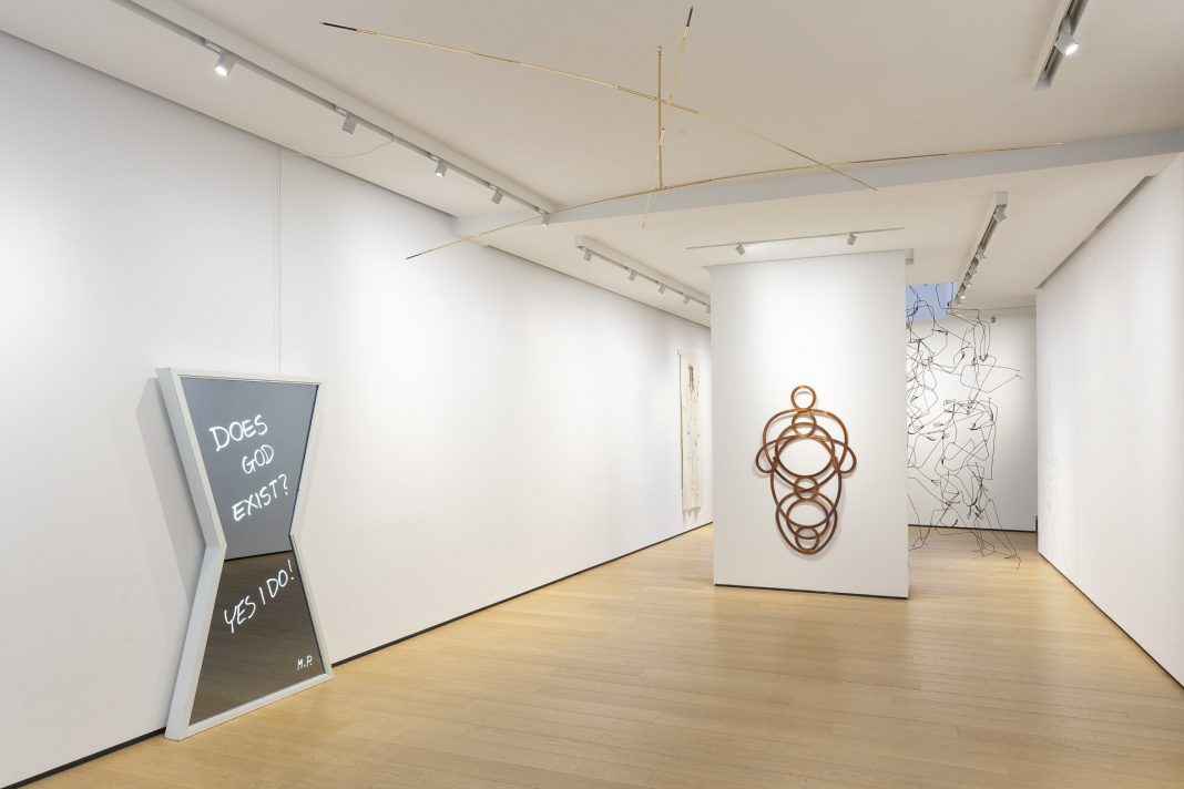 La forza di questo tema scelto, il dibattito su sacro appunto, sta anche nel fatto che sono uscite allo scoperto opere meno facili da vedere esposte. Come nel caso di quella di Maria Lai, “Sindone”, che da forma a una sagoma di Cristo. La corona di spine è ricamata in maniera fitta. Spicca c’è “D’Io” di Gino De Dominicis, un’opera, accompagnata da una parte vocale in cui giocando sulle parole si fa ironia sul concetto di ego, onnipotenza e Dio, appunto. Sempre su questa linea si colloca anche l’opera di Marco Andrea Magni che ha creato un’installazione in ottone che ruota a creare delle aureole per tutti. Vincenzo Agnetti riprende le parole dell’Apocalisse: “Io sono l’Alfa e l’Omega il primo l’ultimo il principio e la fine di tutto quanto”. Emerge qui il pensiero costante di chi fa arte sull’assoluto.
