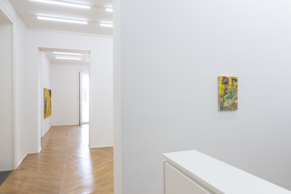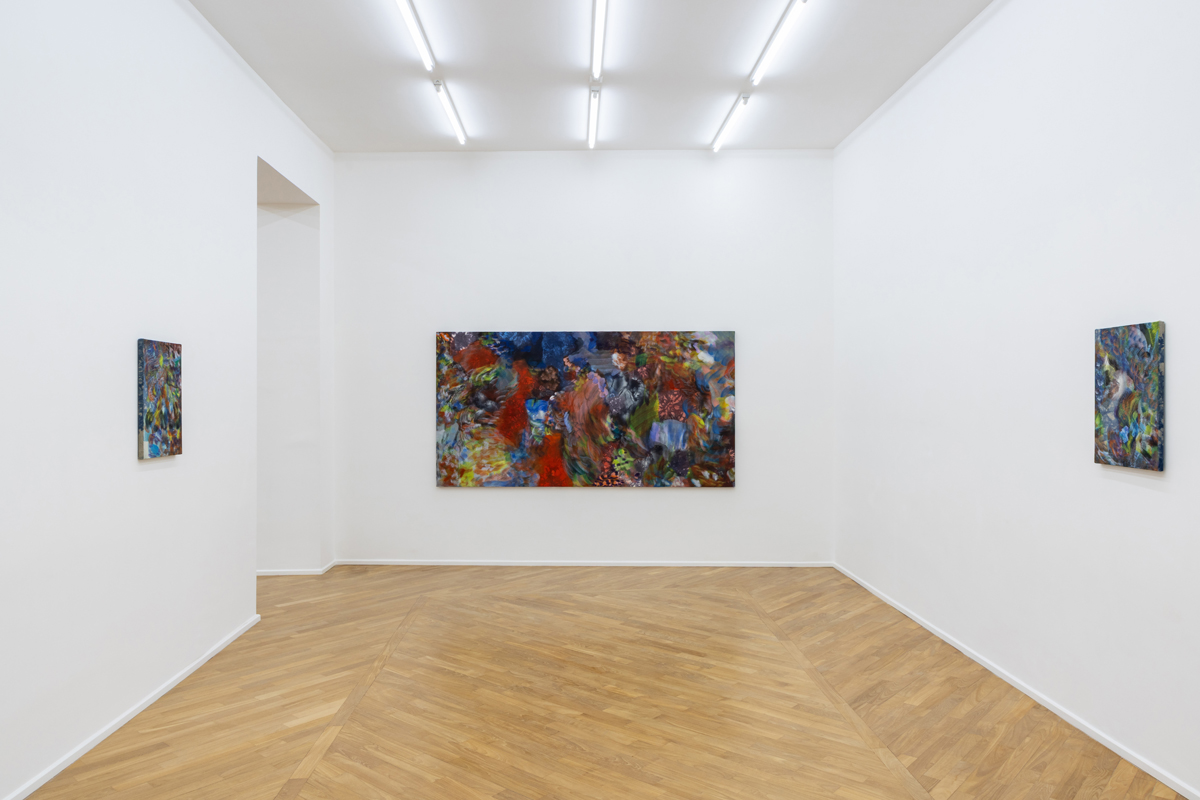 A introdurre la mostra, sono il vento (2025), una piccola tela gialla rettangolare, alterna sulla sua superficie bidimensionale lavorata a tie-dye, alcune pennellate piene di colore rosso, viola, e blu ad altre più ritmiche e rade, visualizzazione delle dragon veins. Nel Feng Shui, le “vene del drago” sono correnti o traiettorie energetiche invisibili che attraversano il paesaggio, modellandolo secondo equilibri sottili di pieno e vuoto. Queste linee di forza che strutturano il mondo naturale e ne determinano l’armonia, sono l’elemento cardine e centrale della mostra a Casa Di Marino e palesano l’evoluzione creativa di Manso verso una maggiore commistione tra colorismo astratto e gestuale alla Joan Mitchell e pensiero ecologico orientale.