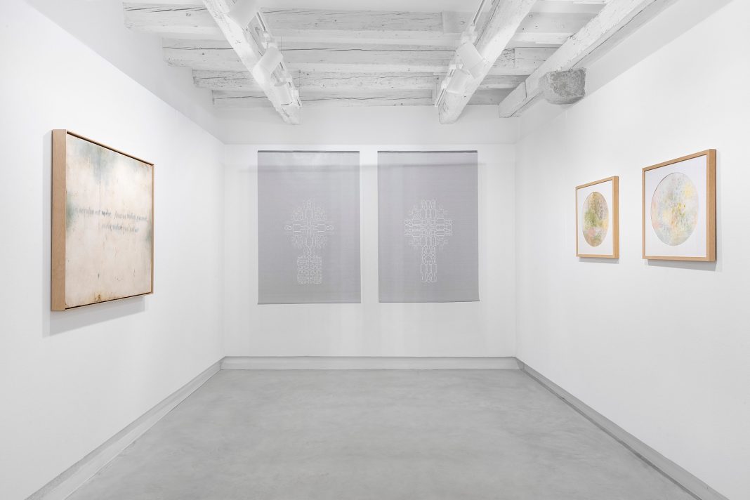 Al termine dell’esposizione, il visitatore incontra infine i lavori di Aldo Grazzi (Mantova, 1954 – Perugia, 2023), in particolare due opere della serie Ruota e Rifletti —protagoniste di una recente mostra presso Spazio Berlendis. Si tratta di creazioni eteree, impalpabili, realizzate con reti in fibra su cui l’artista disegna geometrie intricate con piccole forbici. Per Grazzi, la natura è fonte di ispirazione e riflessione, approccio che si concretizza nell’estrema spiritualità del suo gesto artistico, che diventa così processo meditativo.