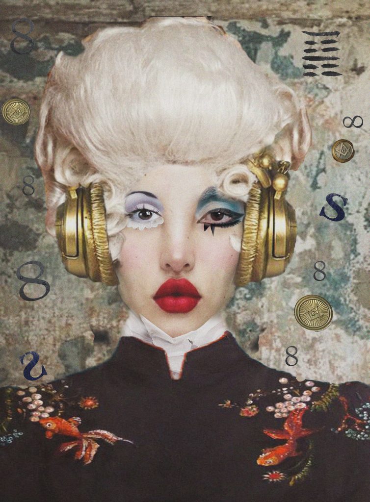 L’isolamento interiore e la condizione di alienazione sono parimenti evocati in opere come “Ritratto” di Samantha Bertolotto, raffigurante il volto di una donna che assume l’aspetto di una di sorta di “icona” moderna con tratti fisiognomici che potrebbero essere allusivi a quelli di emergenti pop star americane (come, ad esempio, Lady Gaga). I tratti umani del viso femminile si perdono nel maquillage parossistico che definisce e sottolinea le labbra ipertrofiche e i grandi occhi spalancati, nella capigliatura assimilabile ad acconciature settecentesche, in quello sguardo fisso e stordito dall’ascolto di messaggi, forse musicali, riguardo ai quali non è dato allo spettatore conoscere la natura specifica.
