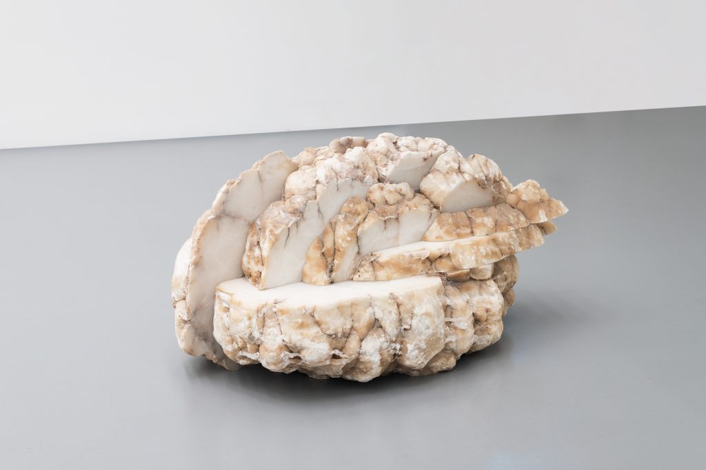 Ci sono nuvole di pietra che, come racconta lo stesso artista, si aprono in linee sottili, al modo di certe antiche pitture rinascimentali, a suggerire lo spazio più ampio del cielo che le ospita, mentre “mostrano i loro sentimenti”. C’è un drappo ricoperto di stelle ricamate, nella stessa posizione di quelle che offre il cielo di Torino nella notte del 31 ottobre, sera dell’inaugurazione della mostra. C’è una foto dell’artista da giovane, con una mano anziana che ne sorregge il mento come se fosse la sua, ma in un altro tempo, in uno scarto temporale ricco insieme di riferimenti pittorici e conseguenze concettuali, ma anche esistenziali. Ci sono foglie di palme in coppia, l’una lasciata al suo stato naturale, l’altra fusa nel bronzo, unite come mani che s’intrecciano, tessendo insieme passato e futuro, vissuto presente ed esperienza trascorsa. Ci sono altre mani che tracciano il cielo e il moto dei pianeti, costellazioni come biglie sul pavimento. Ci sono stelle impilate oppure sparse sul pavimento, come un insieme di stelle, letteralmente uno starsystem. C’è anche un marmo tagliato aguzzo, con la punta che si perde verso l’infinito. Ma c’è anche una pietra cilindrica, che in un punto si fa ellittica e pare incurvarsi sotto il peso leggero dello zucchero a velo che imita la neve. Ci sono due pietre dure che paiono insieme avvicinarsi e tenere le distanze, che sono sculture minimal elegantissime, ma anche simili a due amanti indecisi del tipo “io vorrei, non vorrei, ma se vuoi”.