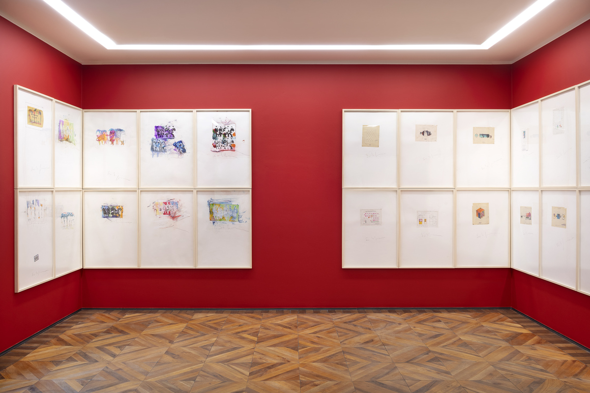 L’allestimento, curato da Andrea Isola, è stato pensato per esaltare il dialogo e il contrasto tra artista e collezionista: le pareti rosse risaltano il bianco delle carte, il flusso di poesie di Malabarba si incasella nelle tele programmatiche di Schifano, fino alla sagoma dell’artista che esce dall’immagine per prendere forma sul pavimento della galleria. Un allestimento che traduce visivamente il gioco di opposti descritto da Marco Meneguzzo nel catalogo della mostra: «riservatezza contro sfrontatezza, riflessione contro sbrigatività, profondità della parola contro superficie (non superficialità) delle immagini, lentezza contro velocità».