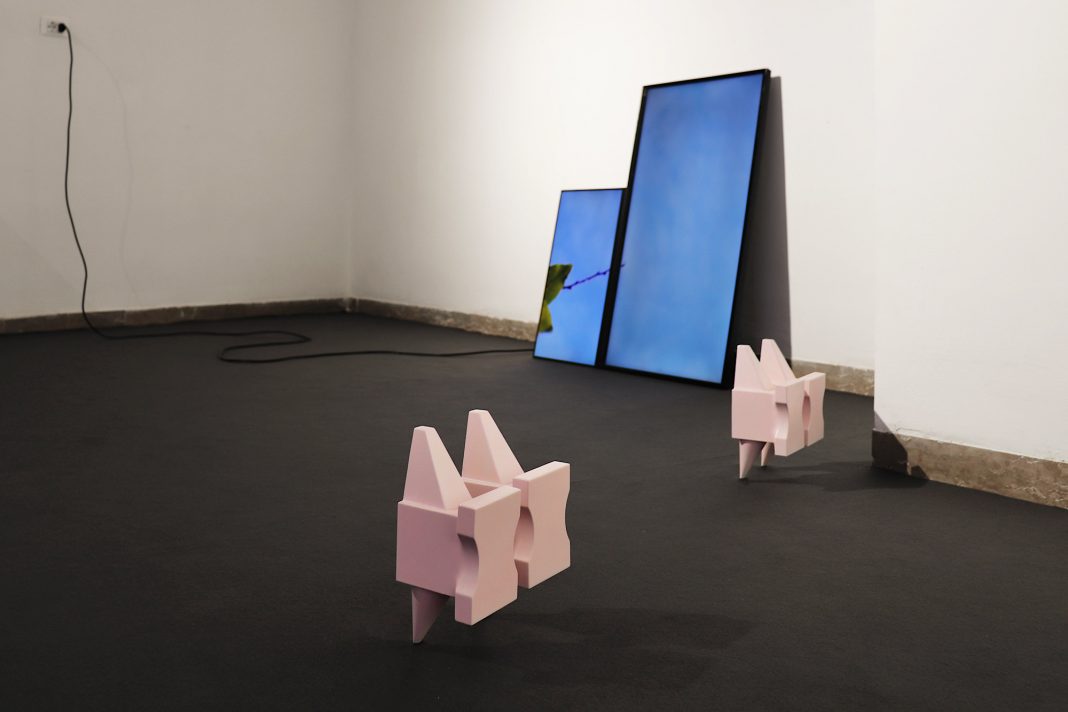 Matteo Rattini, infine, gioca con il nostro senso di attesa: in Dittico (2023), due schermi mostrano la ripresa in tempo reale da una telecamera posizionata all’esterno dello spazio espositivo. Un fiore che si muove piano e qualche nuvola: non c’è altro ad attendere lo spettatore poiché l’opera si sottrae a ogni promessa narrativa, costringendoci a rimanere presenti in un tempo che non concede eventi né svolte.
