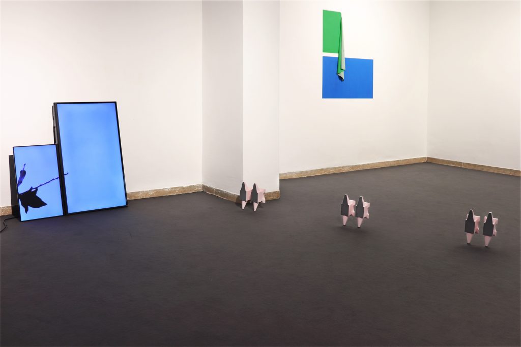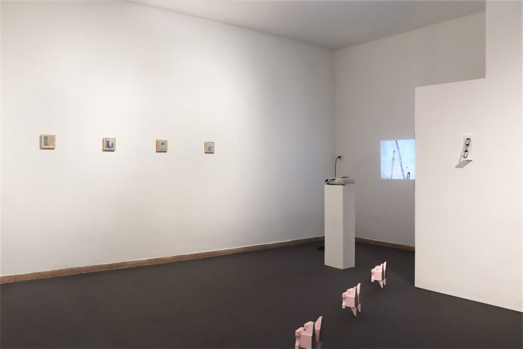 L’allestimento stesso ci chiede di muoverci nello spazio con cautela, per non urtare le piccole incudini rosa che vanno a formare l’installazione In punta di piedi (2023) di Guendalina Urbani. Il lavoro divide diagonalmente lo spazio, appare pesante e delicato al tempo stesso: sfida i sensi e ci chiede di attraversalo con cura.