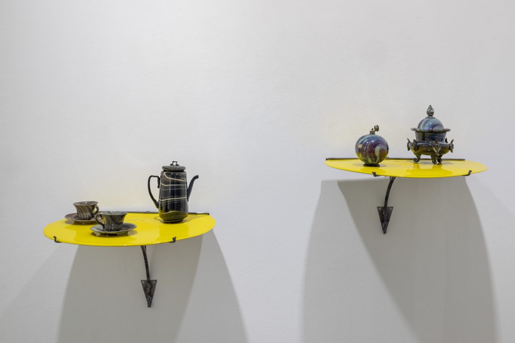 Poiché alcuni vetri calcedoni sono molto scuri, alcuni di questi supporti sono stati trattati con superfici specchianti per valorizzare al meglio le opere esposte e creare riflessi particolari sulle pareti, in dialogo con la luce naturale. Una nota pop, ad esempio, è data da due rui di colore giallo acceso, che contrastano armoniosamente con una boccia portaprofumo e un servizio da caffè composto da tazzine e caffettiera nei toni del beige e del nero.