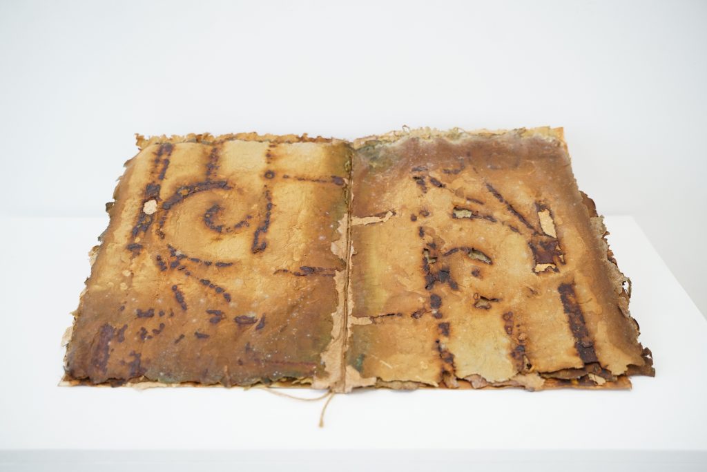Il viaggio nella materia è segnato dalla gestualità tesa alla sperimentazione ma anche da lunghe attese, che portano alla maturazione degli elementi: è il caso del ferro che immerso nell’acqua o a contatto con l’aria si arrugginisce; le tracce del tempo si imprimono poi nella carta o nel tessuto e la memoria materiale è restituita all’osservatore in opere come Scritture di ruggine.