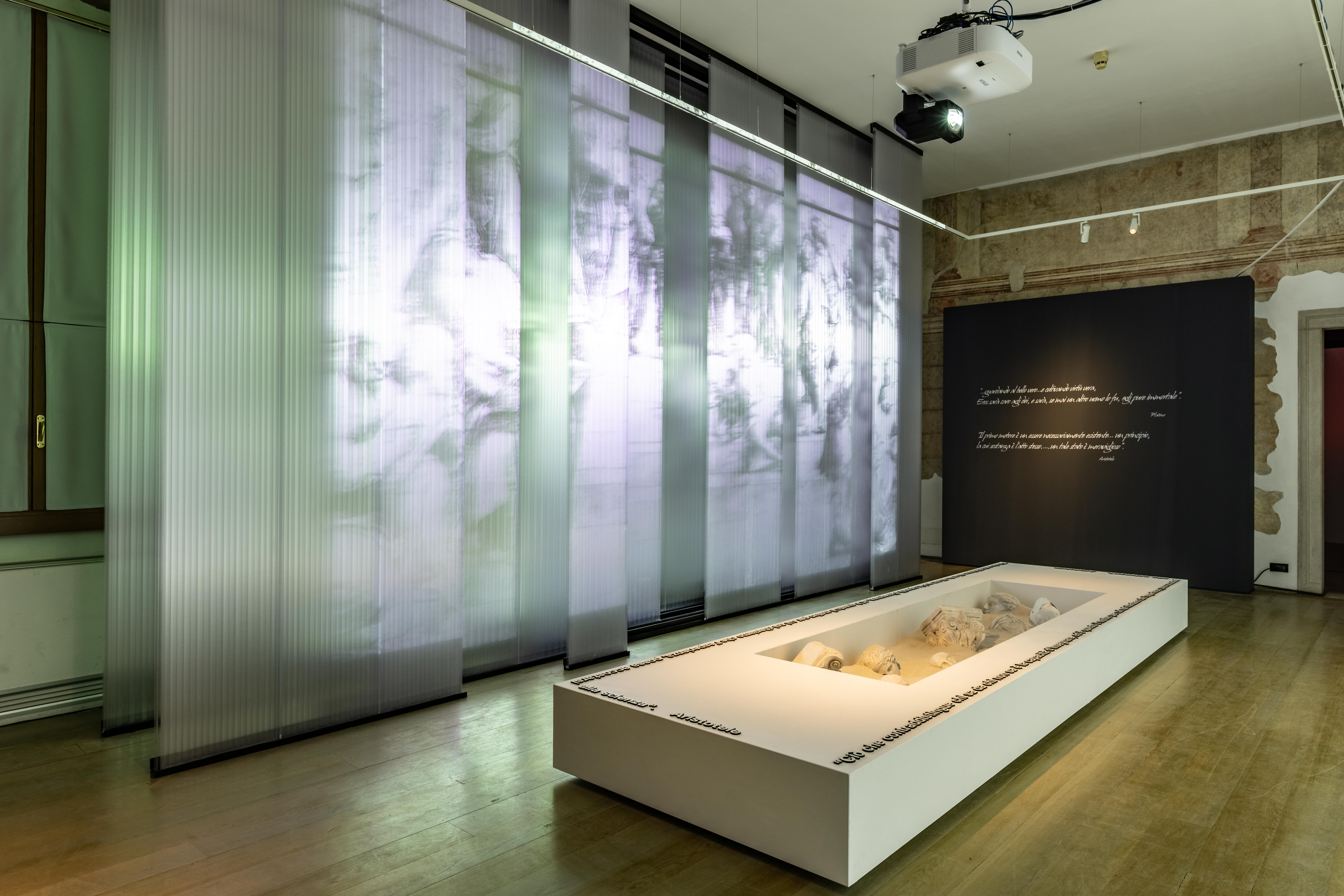 Beatrice Mosca: «Il percorso della mostra trasforma gli ambienti espositivi in luoghi immaginari e simbolici, con una messa in scena allestita in leggerezza, luce, lievità, dove le scenografie, in armonia con il testo e la sceneggiatura, diventano ora simboli dei capitoli del viaggio ora espedienti scenici per proiettare le scene del cortometraggio, le immagini di contributo, le frasi simbolo del cammino della conoscenza, accompagnando gli spettatori, anche attraverso le voci fuori campo e un’inedita colonna sonora, in una visita immersiva e suggestiva. La visione del cortometraggio dialoga armoniosamente con l’allestimento, ed è proiettato non soltanto sulle pareti delle stanze, ma anche sulle soluzioni scenografiche, tutte caratterizzate da una cifra comune: contemporaneità e leggerezza. Dall’ingresso, trasformato in un tunnel di luce e ricamato nell’intreccio di surreale anemoni, agli elementi scenici trasparenti, teli e garze sovrapposte che diventano ora schermi verticali ora forme spaziali, come le nuvole sospese della stanza del mito e l’universo del cosmo contemporaneo, trapassato dalla luce che filtra nella rete materica di filamenti aerei. Sino al termine del percorso dove i personaggi della scena finale, eterei, quasi ologrammi, vengono proiettati su una “non parete” di fitti e sottili fili scenografici che i visitatori attraversano per uscire dalla mostra. L’ alternanza di punti di vista delle proiezioni, la scomposizione delle scene, tra luci, ombre, materia e suoni, rende il percorso dinamico, mai scontato».