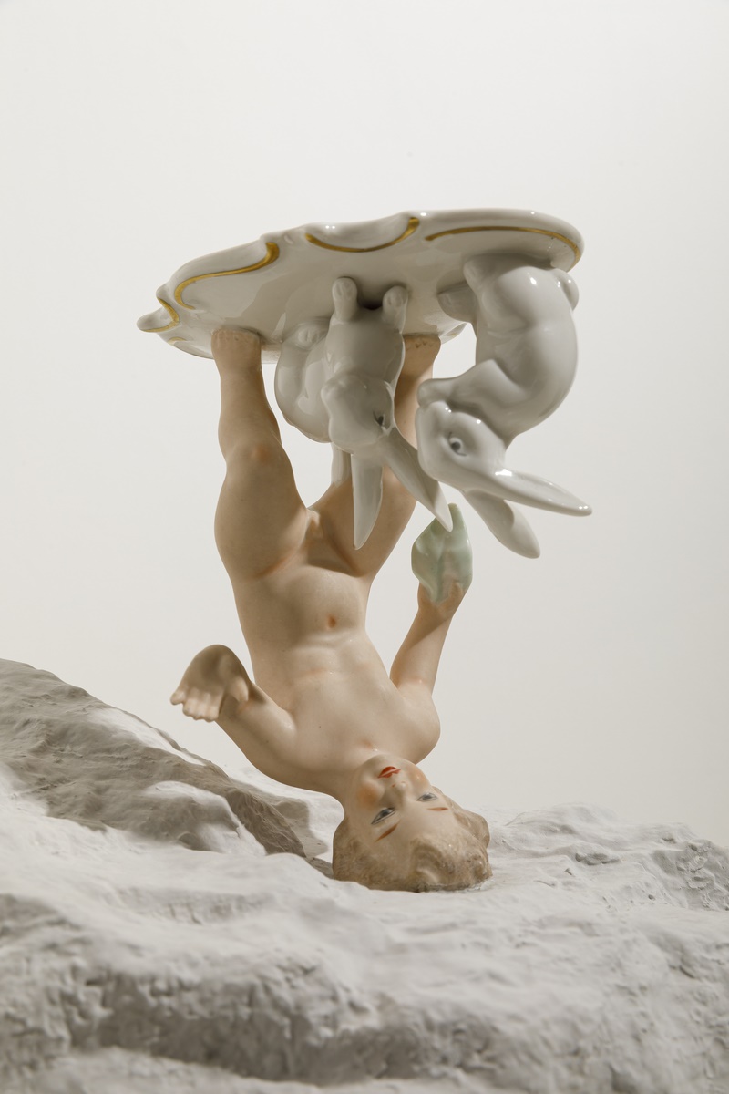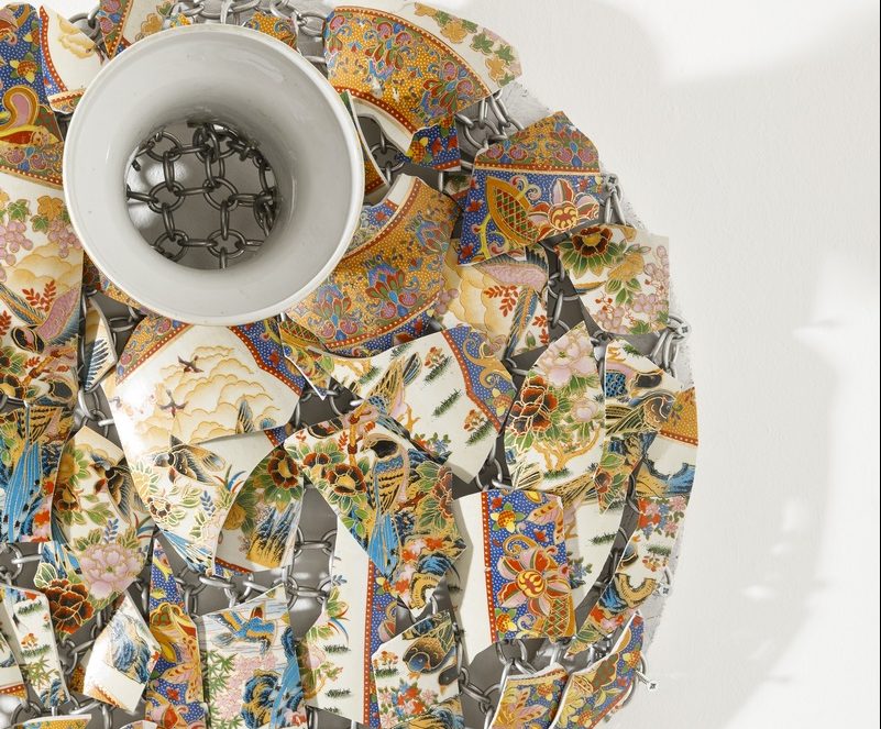 SI passa poi in un piccolo ambiente, anticamera dello spazio successivo, che accoglie le opere di Alberto Gianfreda. La sezione, intitolata “Ripensare all’oggetto”, è una riflessione sull’oggetto, in questo caso il piatto e il vaso, il cui valore d’uso viene negato. L’oggetto infatti viene proposto “in mille pezzi”; l’artista ha distrutto il vaso – o il piatto – con l’obiettivo di coinvolgere il visitatore in prima persona. Se nei musei e nelle gallerie “è vietato toccare” gli oggetti esposti, in questo caso è proprio l’azione performativa e la sua partecipazione a dare senso all’opera. Attraverso l’azione del sollevamento dell’opera, apparentemente massa informe di “cocci” tenuti assieme da catene, l’oggetto prende forma.