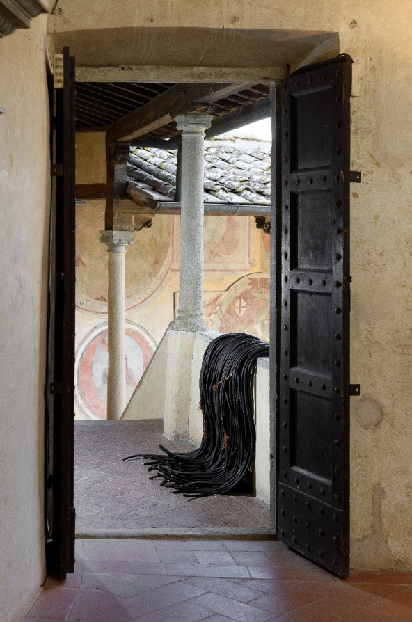 «Il percorso espositivo rappresenta un “passare attraverso”, è un lavoro nello spazio, nato proprio dall’ascolto delle sale, dell’ambiente del Palazzo Pretorio. La posizione del lavoro è parte di esso, che non consente di passare tra le opere, queste sono poste in una condizione di osservazione, bisogna sentirsi esterni a ciò che si guarda.